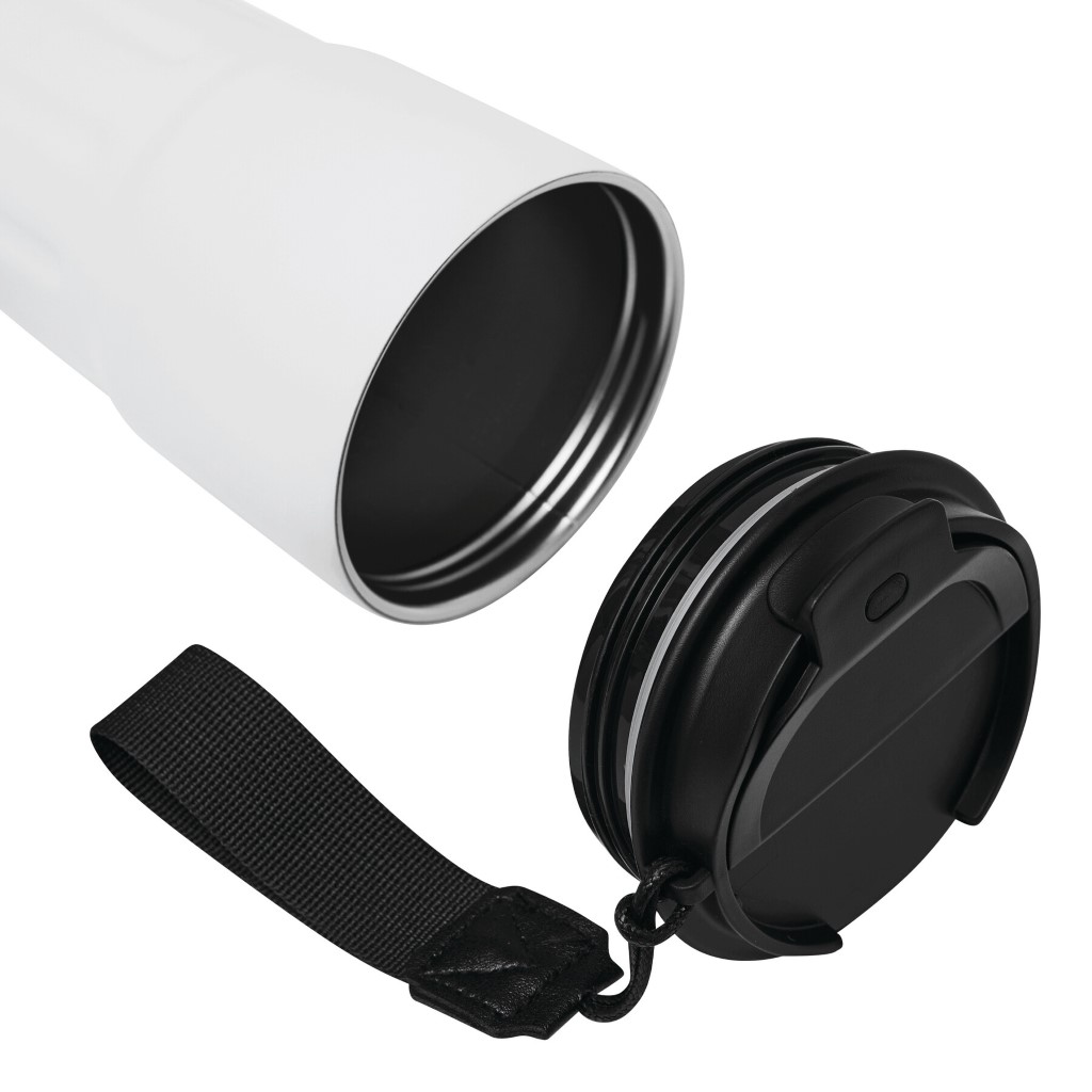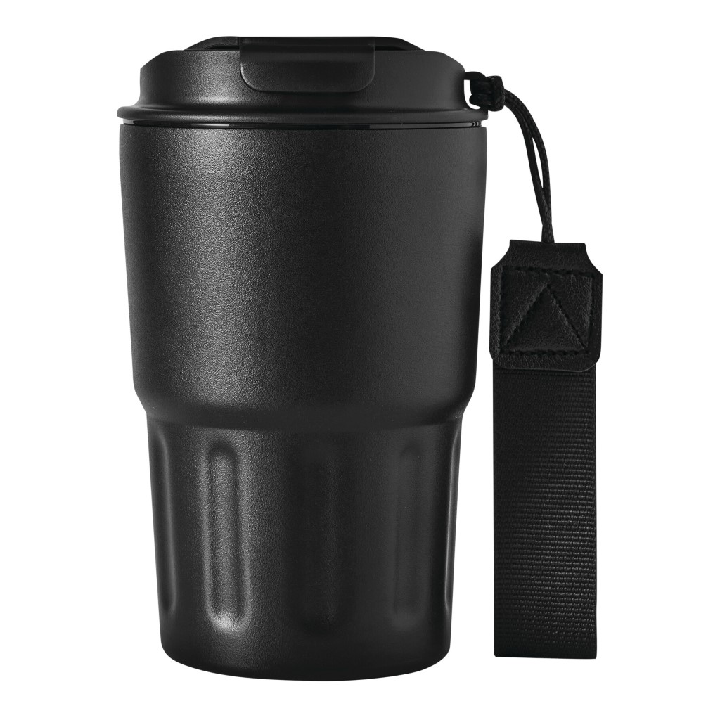 Izolovaný cestovní hrnek TRAVEL MUG, dvoustěnný: vnitřní i vnější strana z nerezové oceli, matný práškový lak, plastové víčko s bezpečným šroubovacím uzávěrem, silikonové těsnění a integrovaný otvor pro pití, objem cca 400 ml, poutko na zápěstí z recyklovaného plastu.