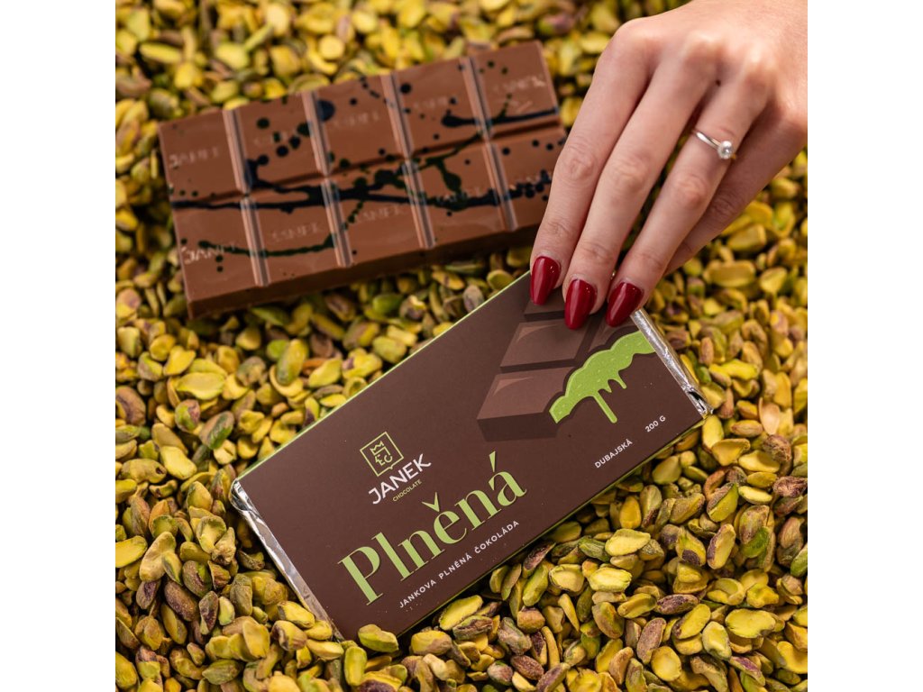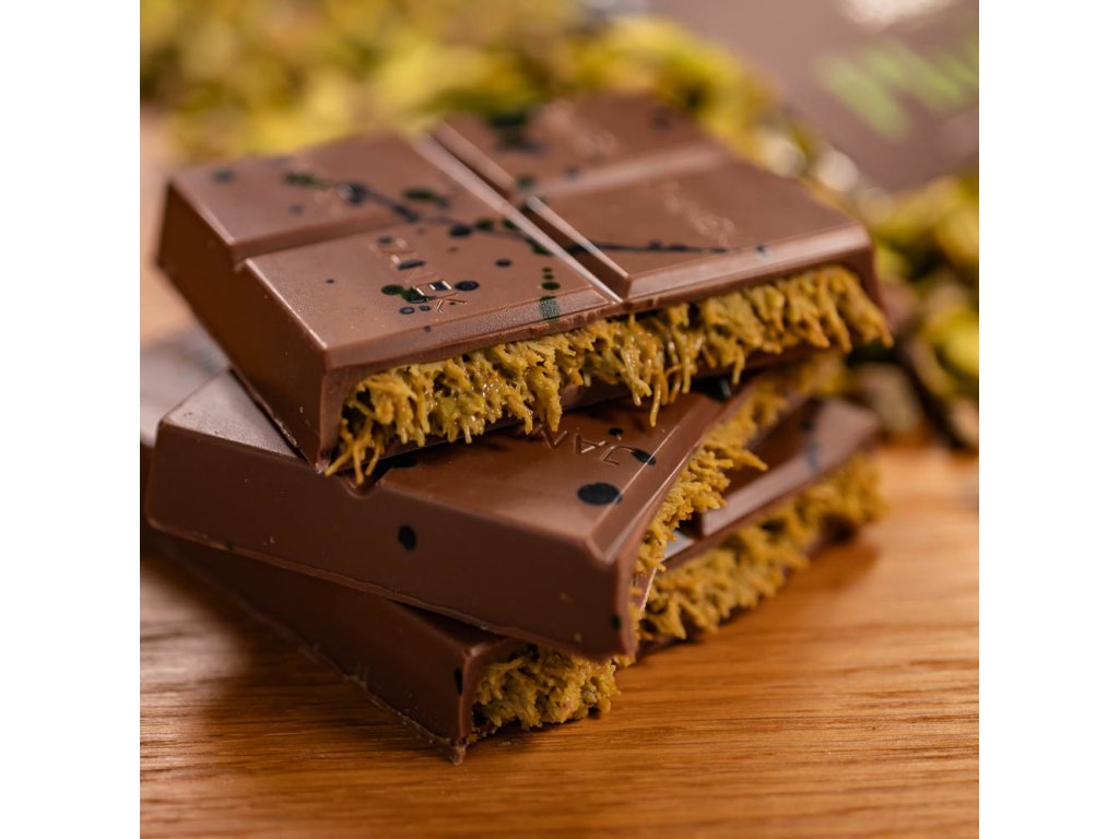 Luxusní mléčná čokoláda s pistáciovým krémem, křupavým kadayifem a jemným nádechem tahini, inspirovaná tradiční dubajskou recepturou. Každý kousek je harmonický zážitek plný elegance a inovace. Obsahuje lepek. Složení: mléčná čokoláda (kakaová hmota 34%, kakaové máslo, sušené mléko, cukr, sójový lecitin, přírodní vanilka), pistáciová pasta, knafeh (pšeničná mouka, pšeničný škrob, sůl, sójový lecitin, slunečnicový olej, tahini, barvivo (E100, E163, E141). Váha: 200 g