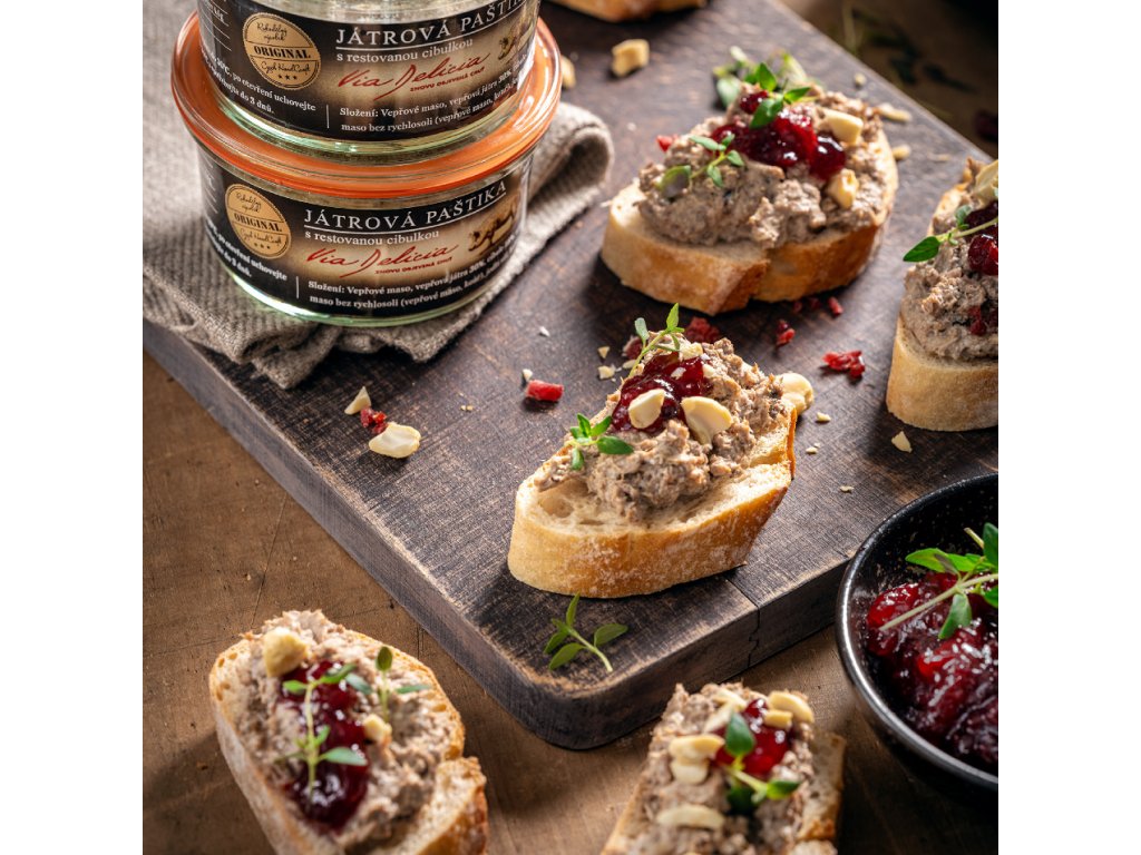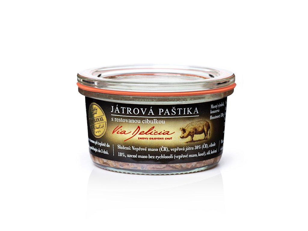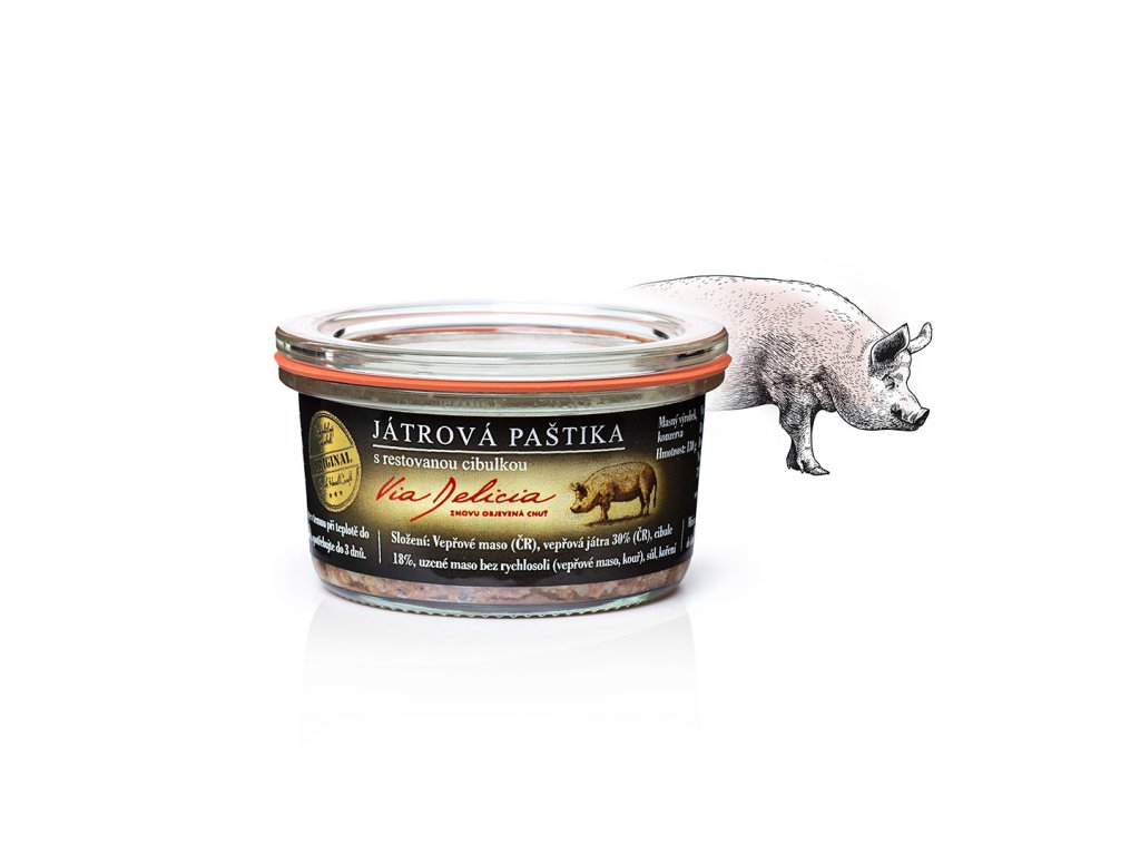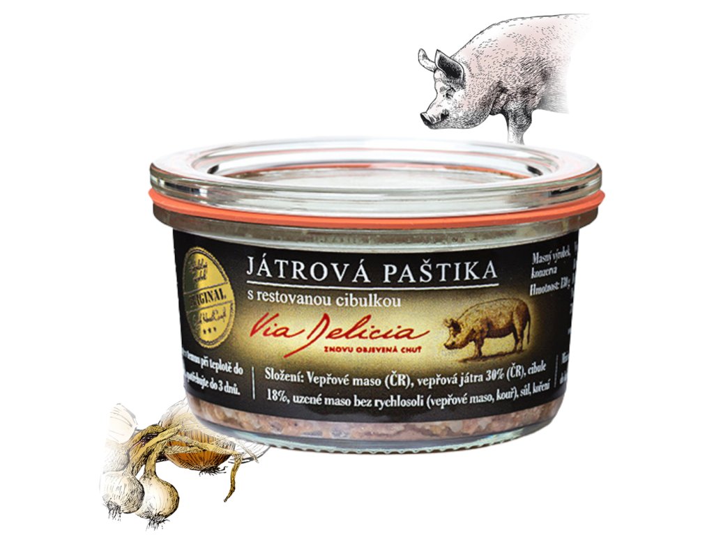Složení: vepřové maso (ČR), vepřová játra 30%, cibule 18%, uzené maso (bez přidaných rýchlosolí), paštikové koření, jedlá sůl