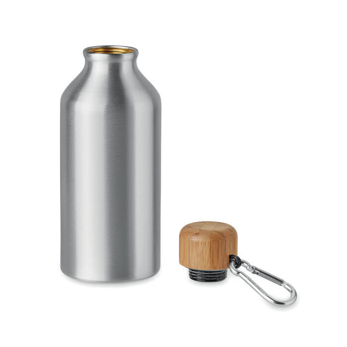 Jednostěnná hliníková láhev s bambusovým víčkem a karabinou (karabina není určena prolezectví, jedná se o reklamní produkt). Objem: 800 ml