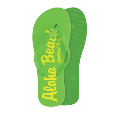 Plážové pantofle ve vybrané barvě. Jednovrstvé s PVC páskem. Hladký povrch, páskový vzor na spodní podrážce (tloušťka 15 mm). Na pantofle je možný fotografický potisk nebo sítotisk. PVC štítek na obou popruzích za příplatek.