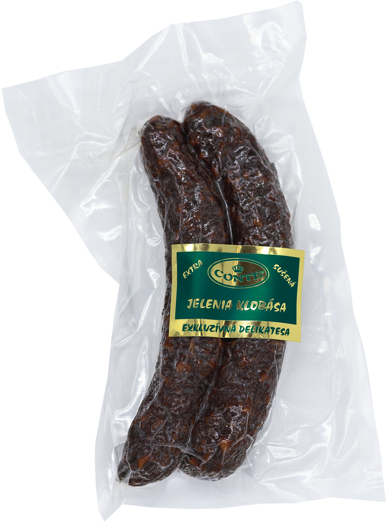 Jelení extra sušená klobása – tradiční delikatesa ze 62% jeleního, 26% vepřového a 10% hovězího masa. Ochucená česnekem, zázvorem a přírodními kořeninami, bez éček, vakuově balená. Skutečná chuť přírody ze Strážovských vrchů. Skladujte v chladu a suchu (0–24°C), po otevření spotřebujte do 48h. Jelení i hovězí maso pochází z vlastního volného chovu.