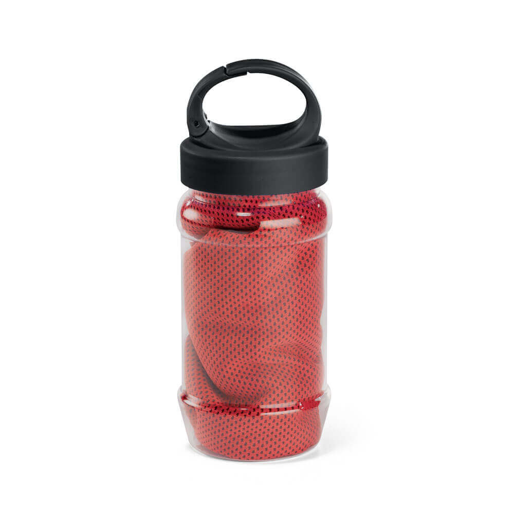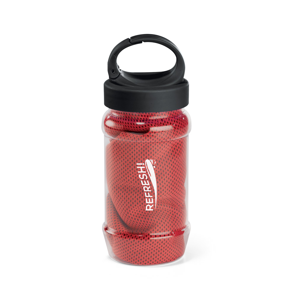 Praktický polyamidový a polyesterový sportovní ručník s obalem ve tvaru láhve. Láhev z PP a PET. Ručník je osvěžující a pokud je vlhký, vydrží chladný několik hodin. Pokud se zahřeje, stačí jej protřepat, čímž znovu získá své chladivé vlastnosti. Tento výrobek lze prát v pračce a lze jej tedy znovu použít. Láhev je součástí balení. Objem až 440 ml.