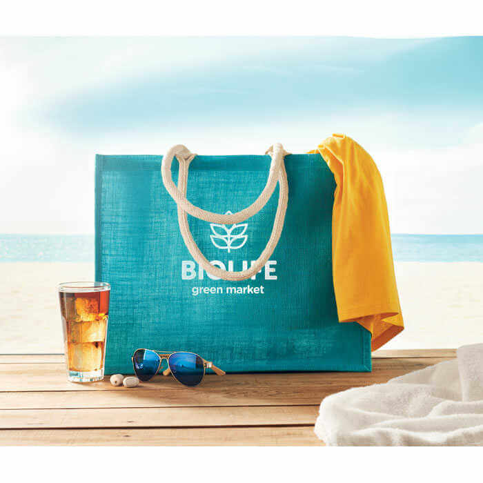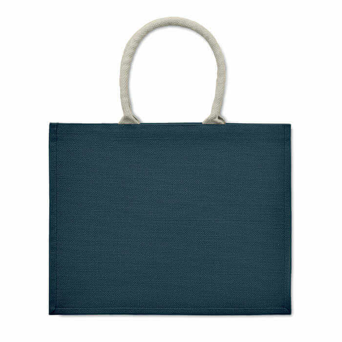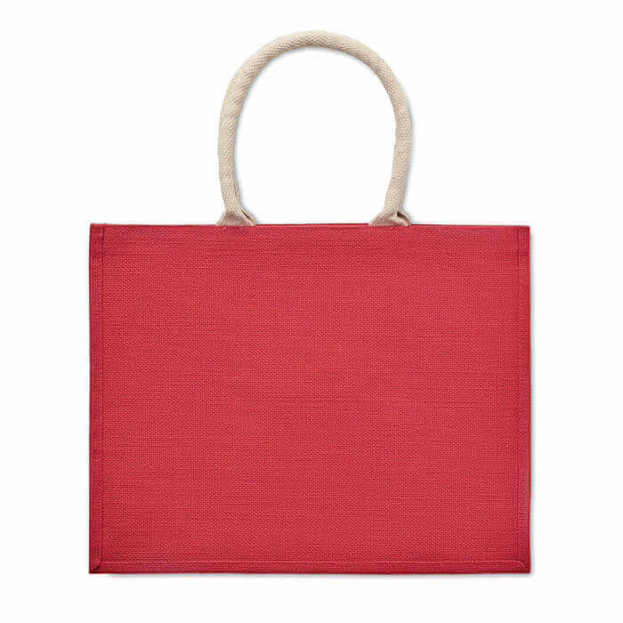 Jutová laminovaná nákupní taška s krátkými bavlněnými uchy. Díky jutovému materiálu tato taška vyniká a vypadá přirozeně. Je to ideální taška na nákup potravin nebo k použití jako plážová taška. Hmotnostní limit pro přenášení: 2,5 kg.