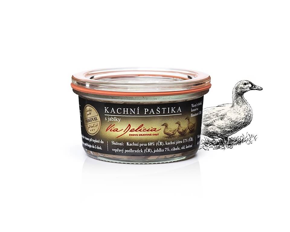 Kachní paštika s jablky Via Delicia je nejjemnější a nejoblíbenější paštika z kachního masa a kachních jater, doplněná pečenými jablky a restovanou cibulkou. Vynikající na pečivo i do studených mís, potěší všechny milovníky kachních delikates.