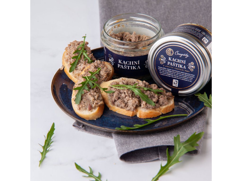 Kachní paštika s uzenými kachními prsy v sobě spojuje tradiční chutě a jemné uzené tóny. Díky pečlivé přípravě je krémová, bohatá a potěší každého milovníka kachního masa. Skvělá na čerstvý chléb nebo jako delikatesa k vínu. Složení: kachní maso (min. 30%), uzená kachní prsa (22%), kachní játra (22%), kachní tuk, česnek, jedlá sůl, pepř. Bez lepku a konzervantů. Váha: 170 g