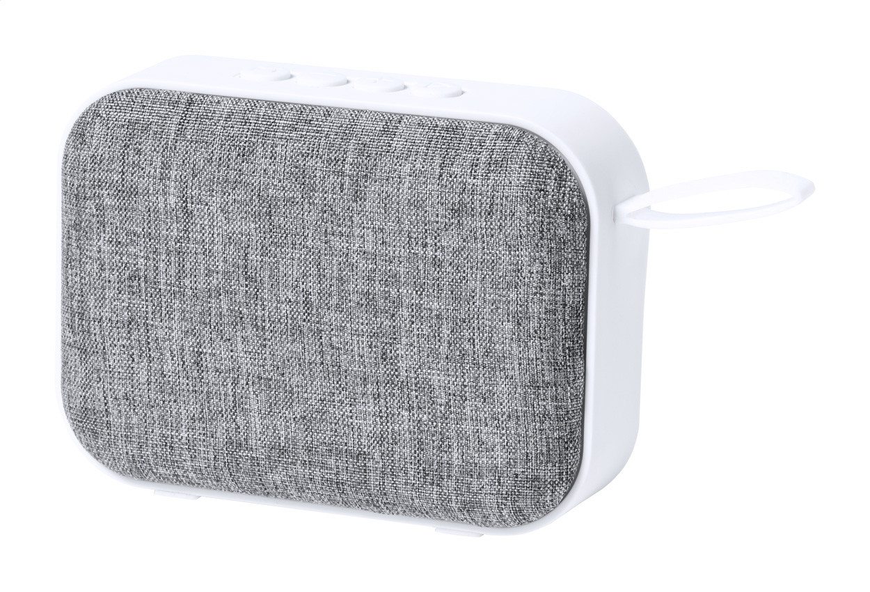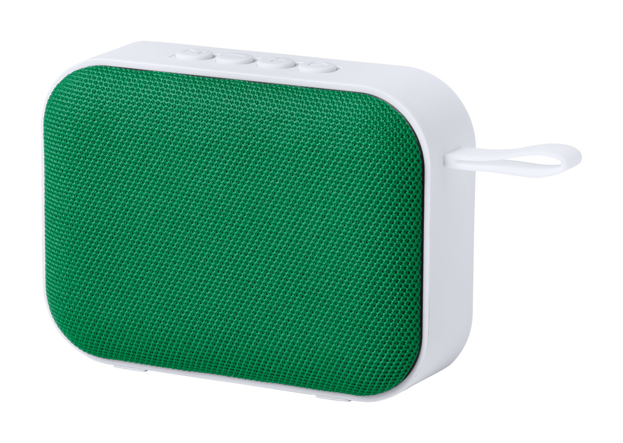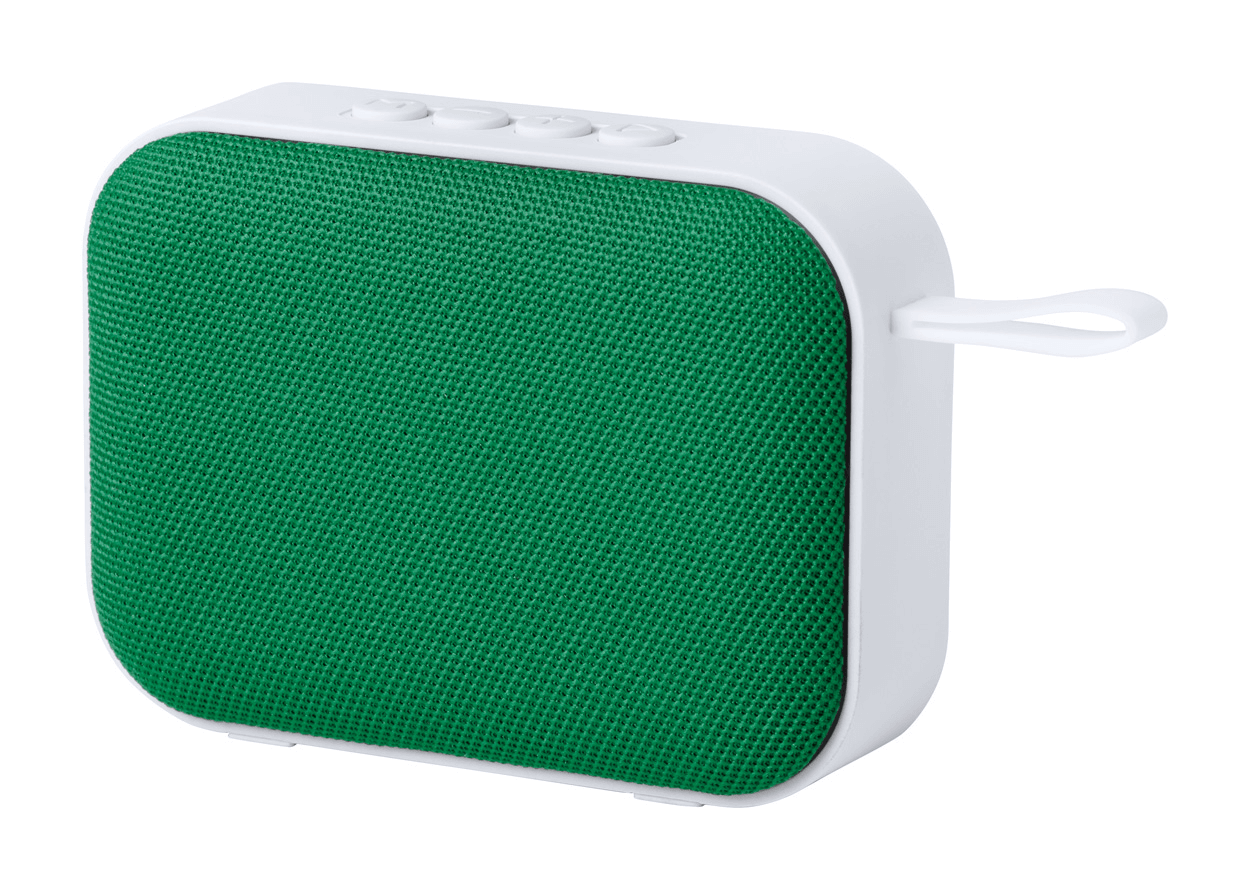 Bluetooth reproduktor s hands-free voláním, FM rádiem, USB a funkcí micro SD přehrávače. S plastovým pouzdrem, polyesterovou tkaninou reproduktoru a dobíjecí baterií. Včetně nabíjecího kabelu USB.