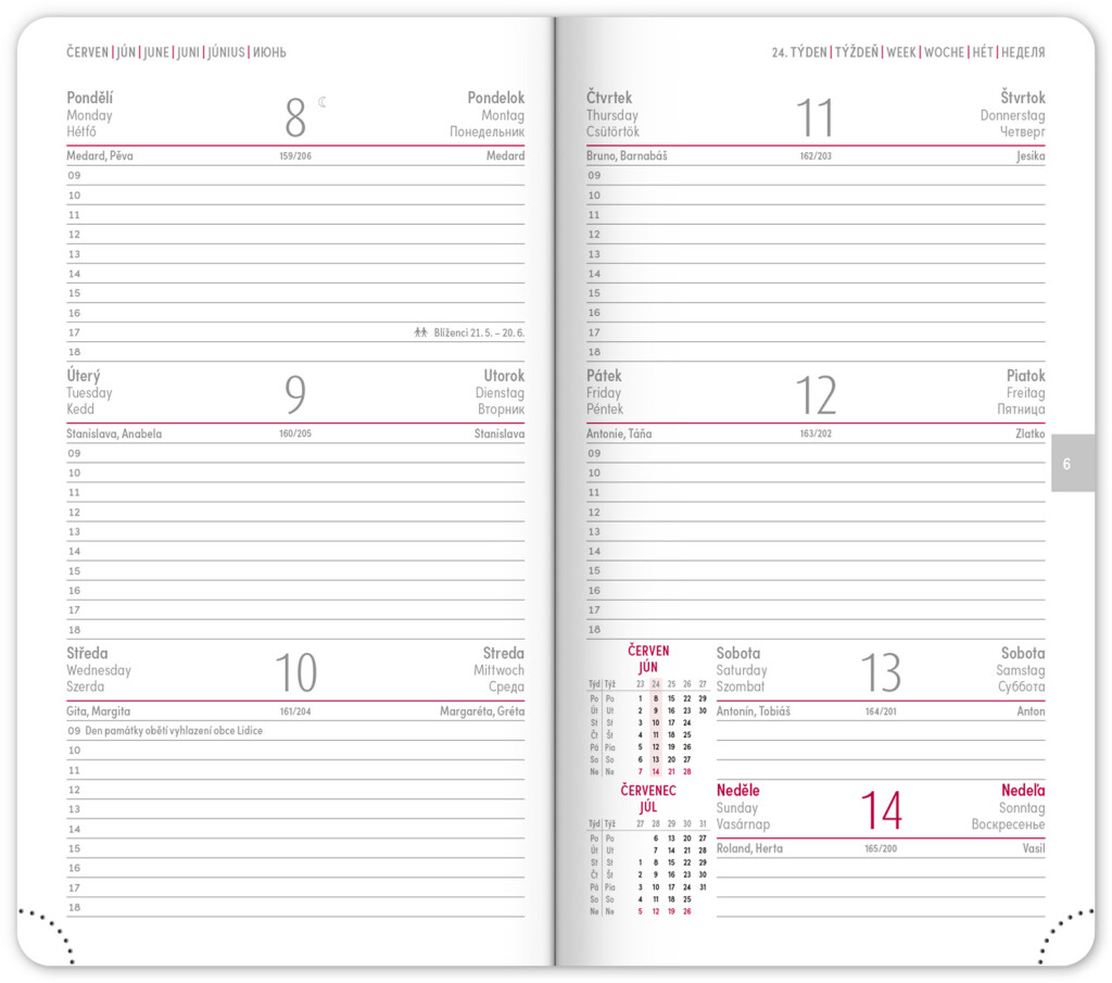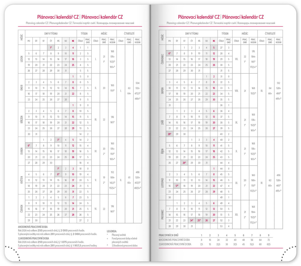 Kapesní diář Aprint 2026. Kolekce vsadila na osvědčené barvy, které doplňuje nová ražba letopočtu. Týdenní rozvrh s československým kalendářiem a doplňkovou angličtinou, němčinou, maďarštinou a ruštinou.