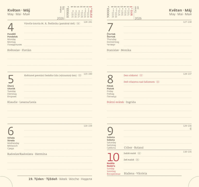 Diář obsahuje: osobní údaje, plánovač dovolené (měsíční přehled), plánovací kalendář, mezinárodní svátky, roční výhled, týdenní layout, adresář
