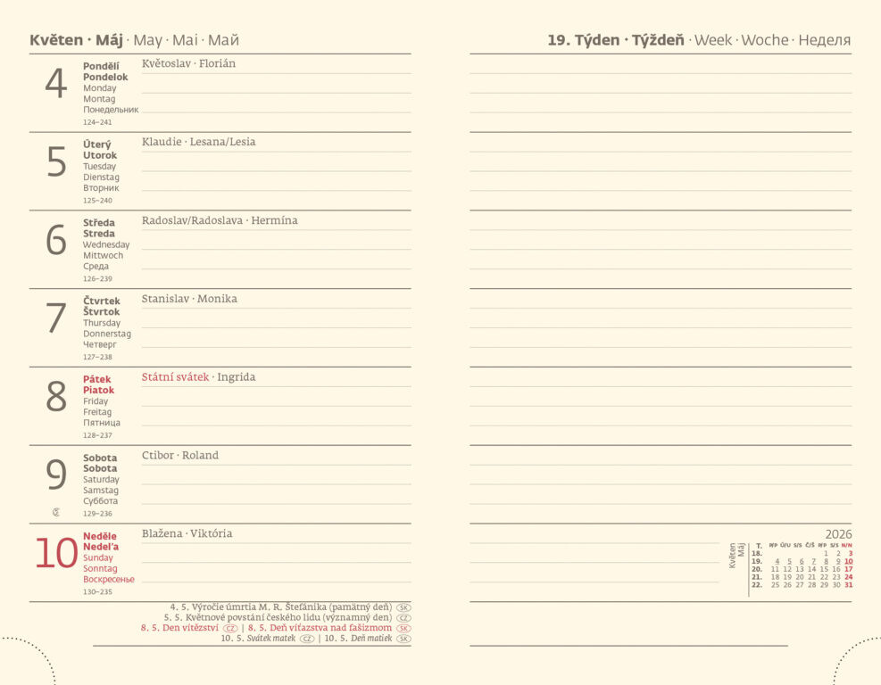 Diář obsahuje: osobní údaje, plánovač dovolené (měsíční přehled), plánovací kalendář, mezinárodní svátky, roční výhled, týdenní layout, adresář
