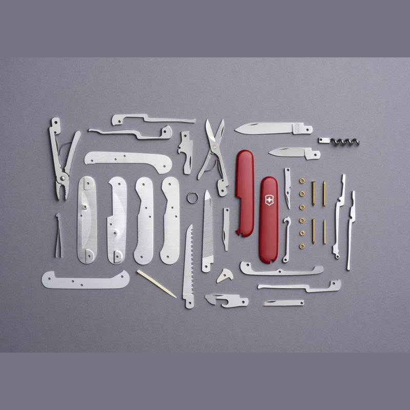 Součásti: 1. velká čepel 2. malá čepel 3. otvírák na láhve s: 4. - plochý šroubovák 5. - ohýbačka drátu/odizolovač drátu 6. otvírák na konzervy s: 7. - malý plochý šroubovák 8. víceúčelový hák 9. nůžky 10. kleště 11. drátová řezačka 12. krimpovačka drátu 13. dláto 14.čistič nehtů 15.vývrtka 16.pilka na kov 17.pilník 18.velká ozubená pilka 19.vystružovač s: 20.- šicí oko 21.párátko 22.pinzeta 23. klíčenka
