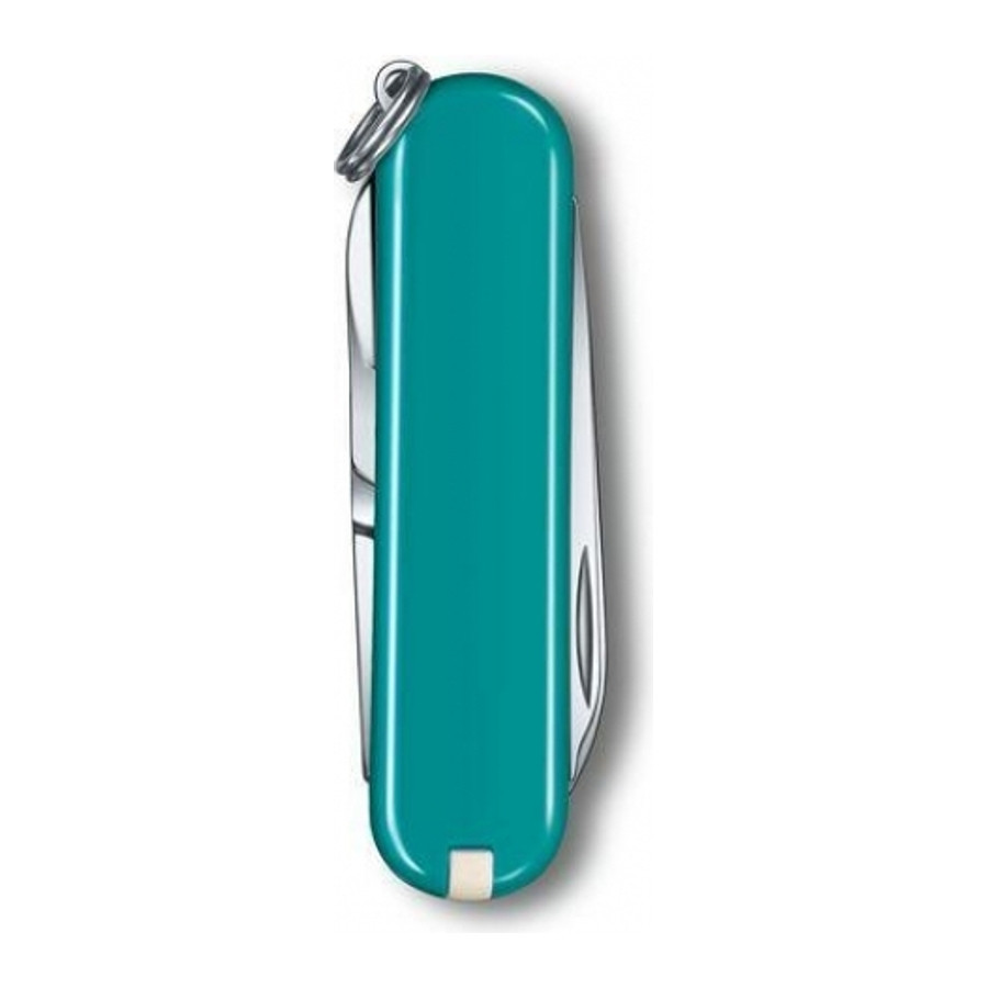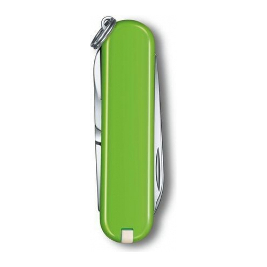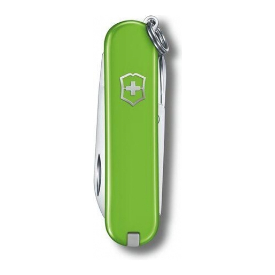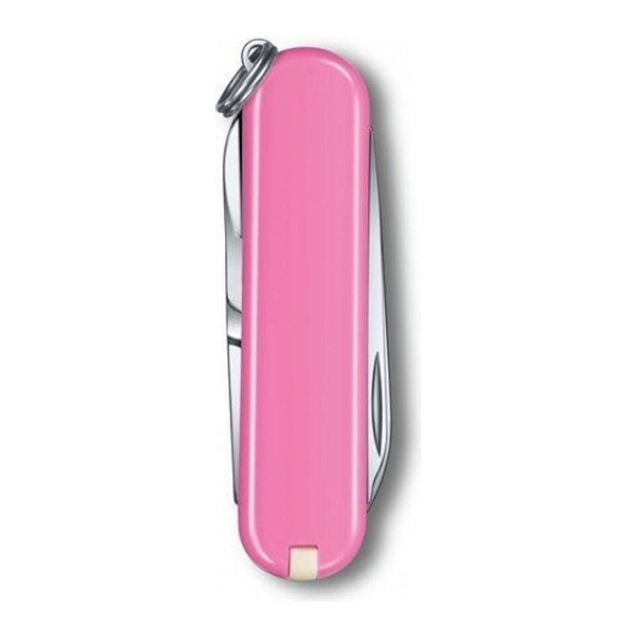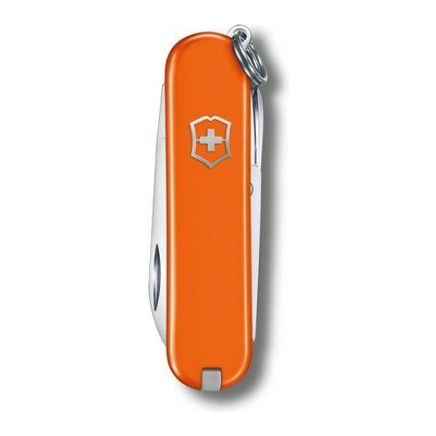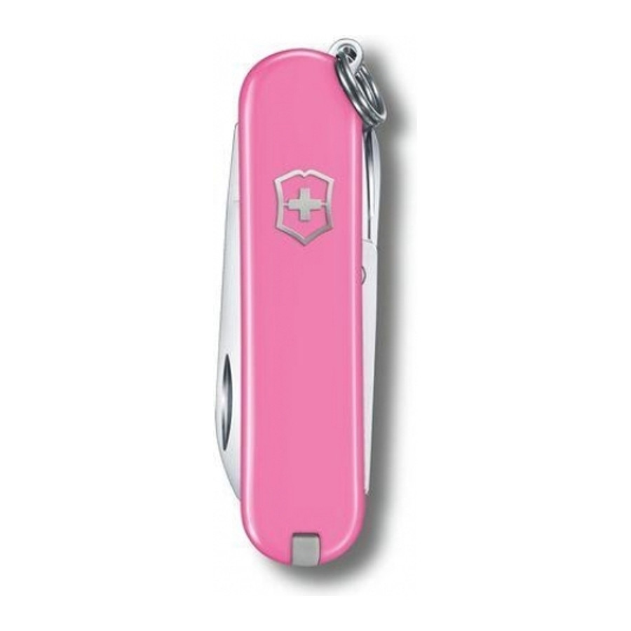 Švýcarský kapesní nůž obsahuje: malý nůž na krájení, mini nůžky, pilník na nehty s hrotem pro šroubování, párátko, pinzetu, klíčenku.