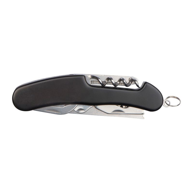14-dílný kapesní nůž vyrobený z nerezavějící oceli, který obsahuje: otvírák na konzervy, nůžky, odstraňovač háků na ryby, odstraňovač šupin na ryby, pilový nůž, nůž, štěrbinový šroubovák, otvírák na konzervy, kroužek na klíče, vývrt , výstružník a křížový šroubovák.