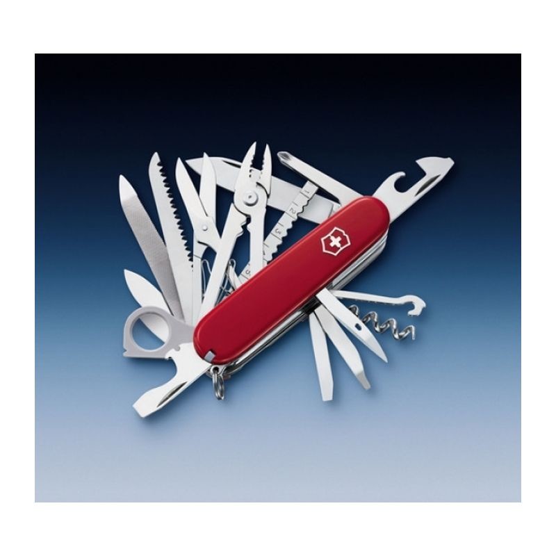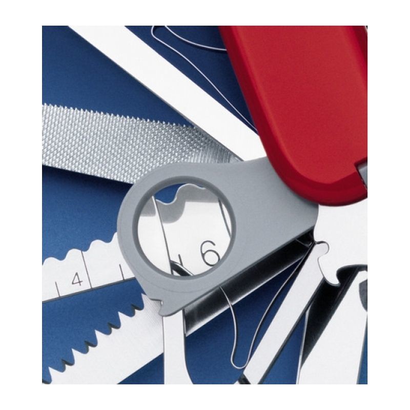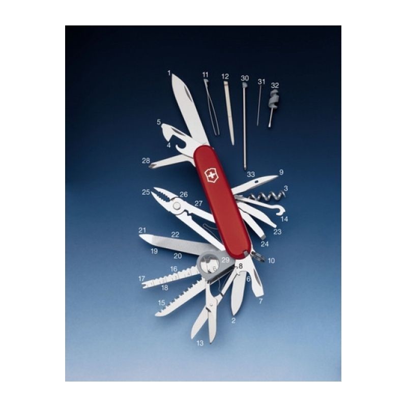 Vlastnosti: 1. velká čepel 2. malá čepel 3. vývrtka 4. otvírák na konzervy s 5. malým šroubovákem 6. zvedač uzávěrů s 7. šroubovák 8. ořezávač drátu 9. výstružník 10. kroužek na klíče 11 . . párátko 14. víceúčelový háček (nosič balíků) 15. pilka na dřevo 16. odstraňovač slupek na ryby 17. vyhazovač háků 18. pravítko (cm + palce) 19. pilník 20. pilník na kov 22. čistič nehtů 23. jemný šroubovák 24. dláto/škrabka 25. kleště s 26. krimpovacím nástrojem 27. nůžky na dráty 28. křížový šroubovák 29. lupa 30. kuličkové pero 31. špendlík nerez 32. minišroubovák 33. očko na šití