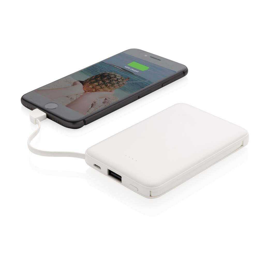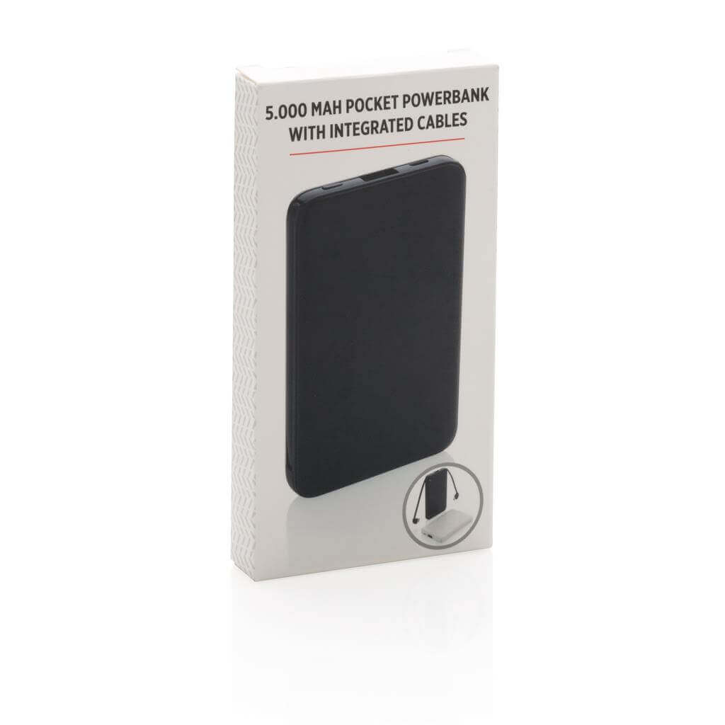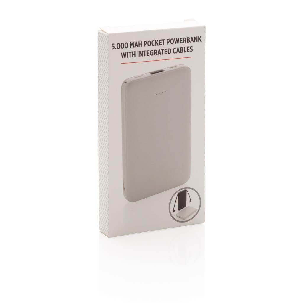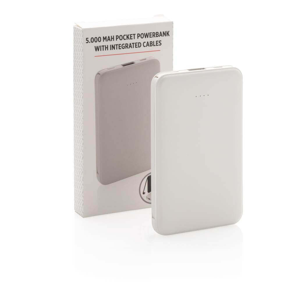 Kompaktní tenká powerbanka vyrobená z odolného ABS s integrovaným TPE kabelem 3 v 1, pomocí kterého nabijete jakýkoliv telefon na trhu. Obsahuje vysoce kvalitní lithium polymerovou baterii řady A o kapacitě 5 000 mAh. Poskytuje tak dostatek energie pro plné nabití vašeho telefonu až 2x. Včetně indikátorů stavu nabití. Vstup 5V/2A; Výstup 5V/2A. 1 baterií typu Li-poly v balení.