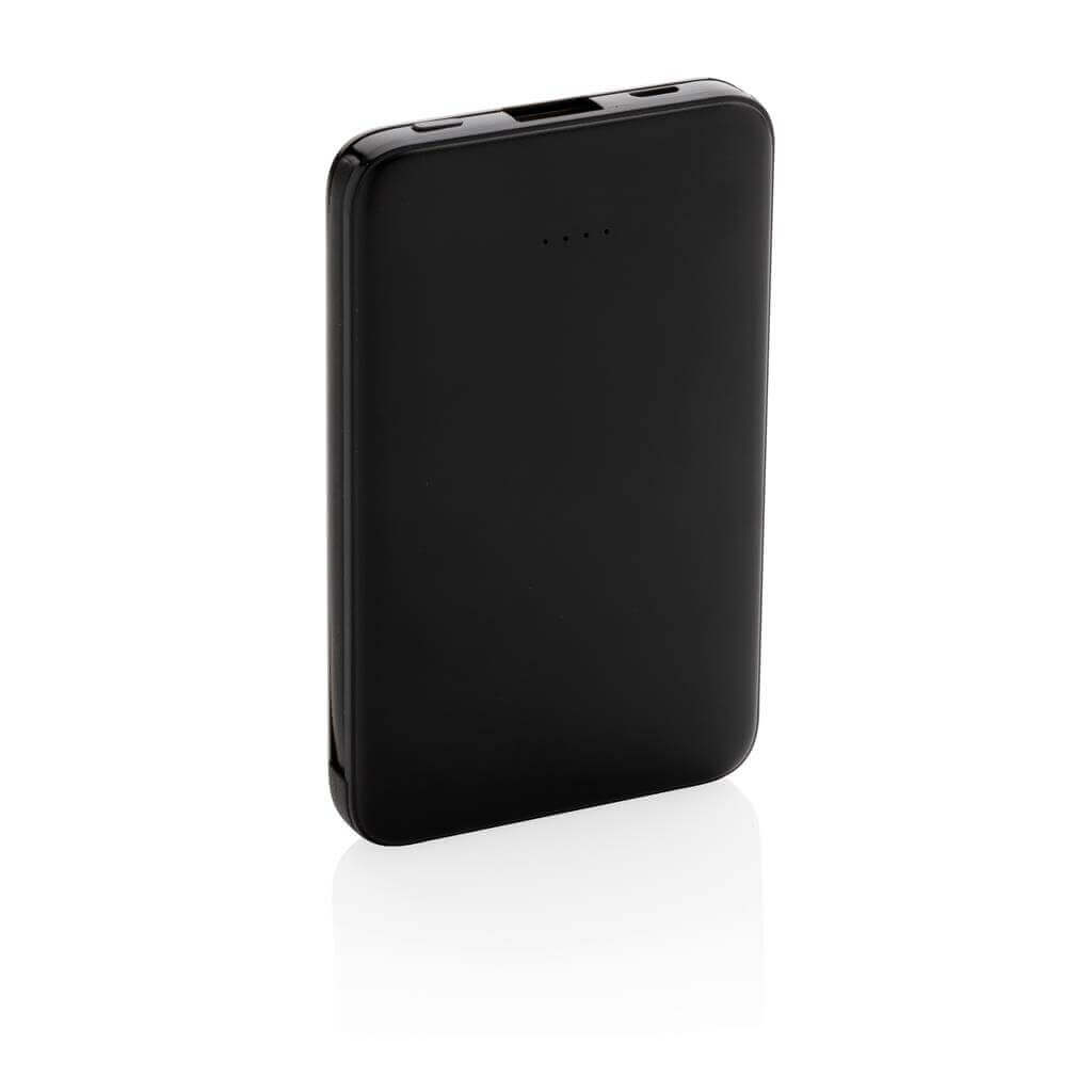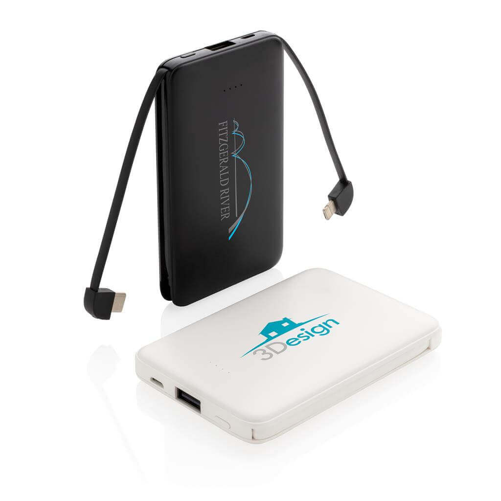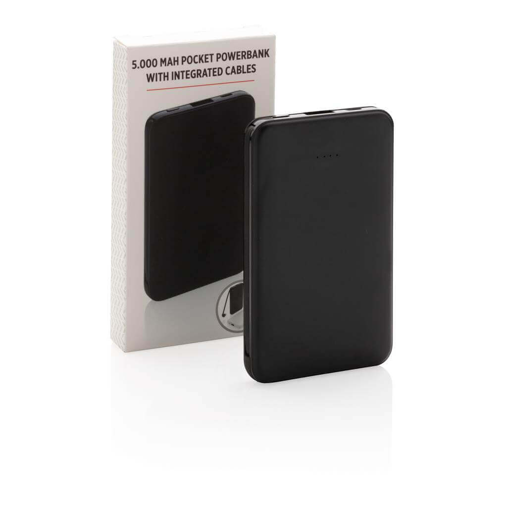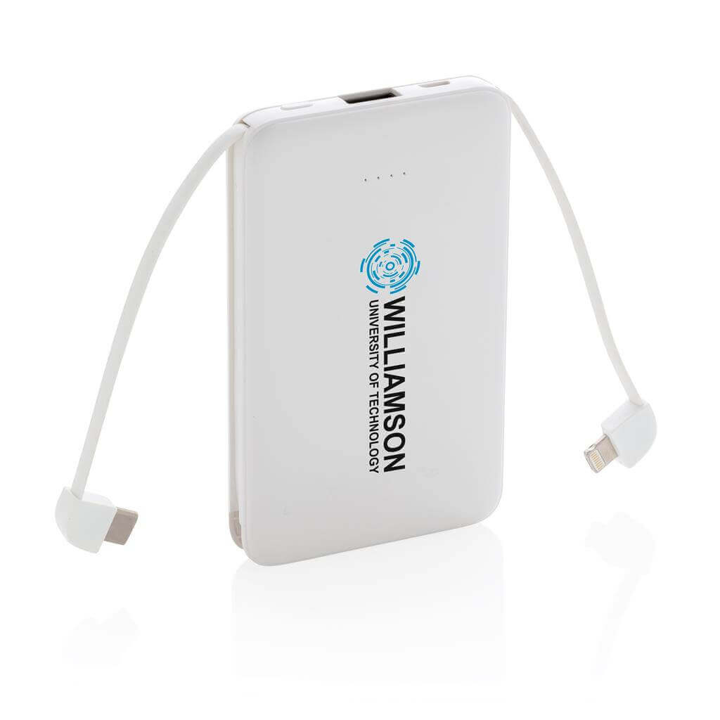 Kompaktní tenká powerbanka vyrobená z odolného ABS s integrovaným TPE kabelem 3 v 1, pomocí kterého nabijete jakýkoliv telefon na trhu. Obsahuje vysoce kvalitní lithium polymerovou baterii řady A o kapacitě 5 000 mAh. Poskytuje tak dostatek energie pro plné nabití vašeho telefonu až 2x. Včetně indikátorů stavu nabití. Vstup 5V/2A; Výstup 5V/2A. 1 baterií typu Li-poly v balení.