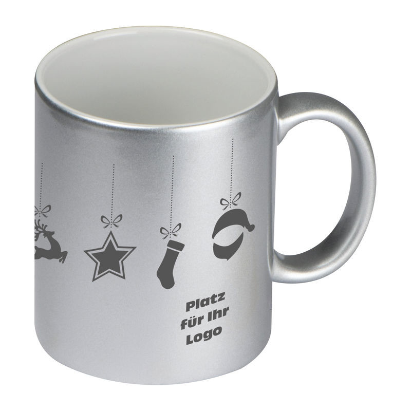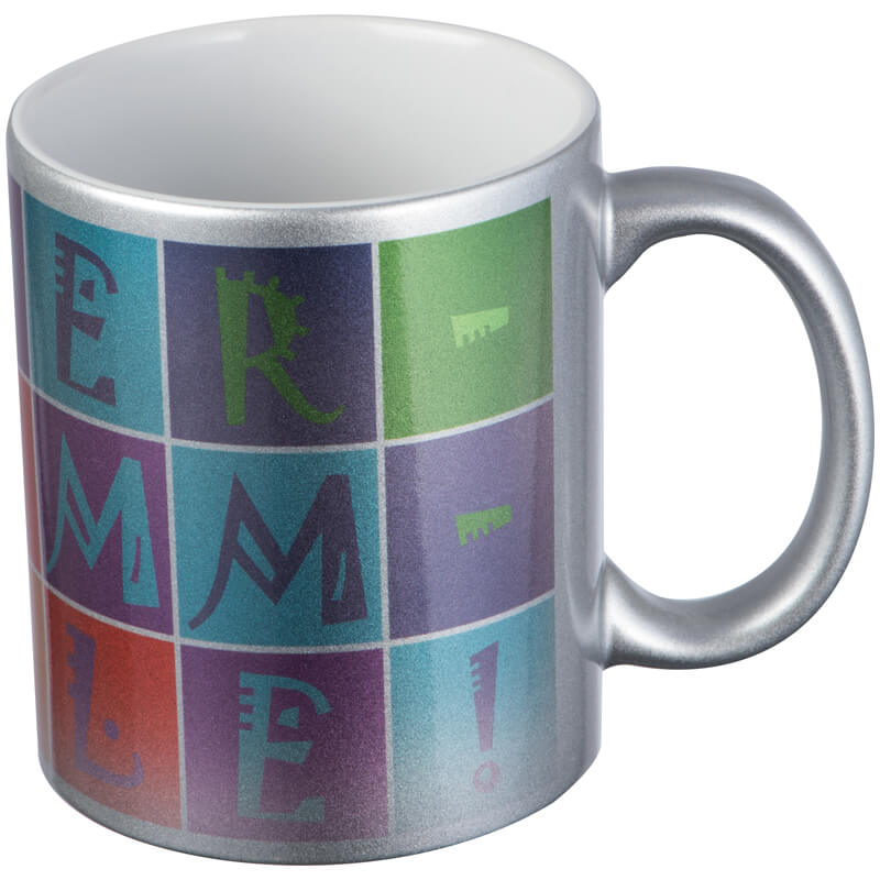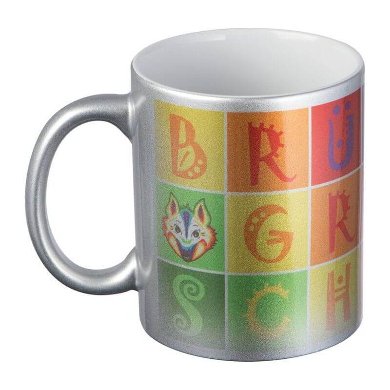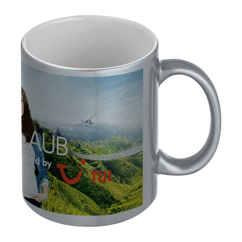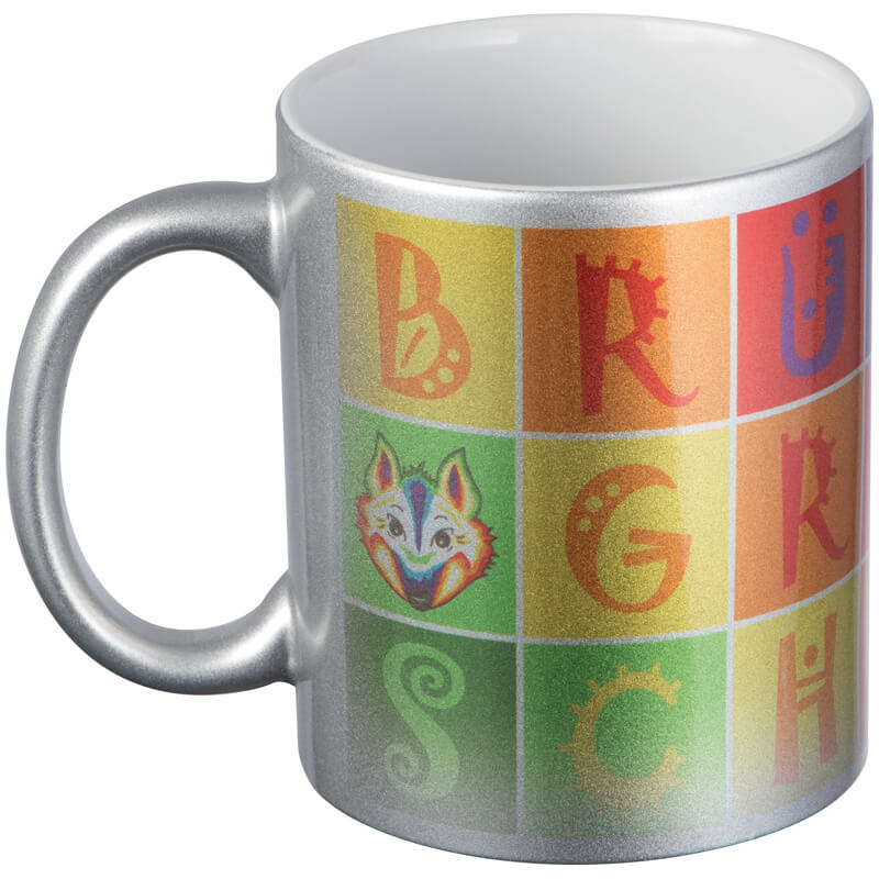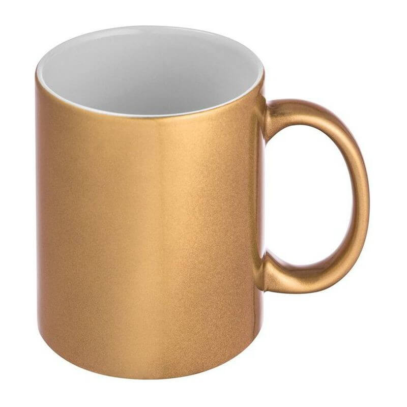 Klasický kávový hrnek s metalickým efektem vnějšího povrchu, s obsahem 300 ml. Na umístění Vašeho loga doporučujeme použít sublimační potisk.