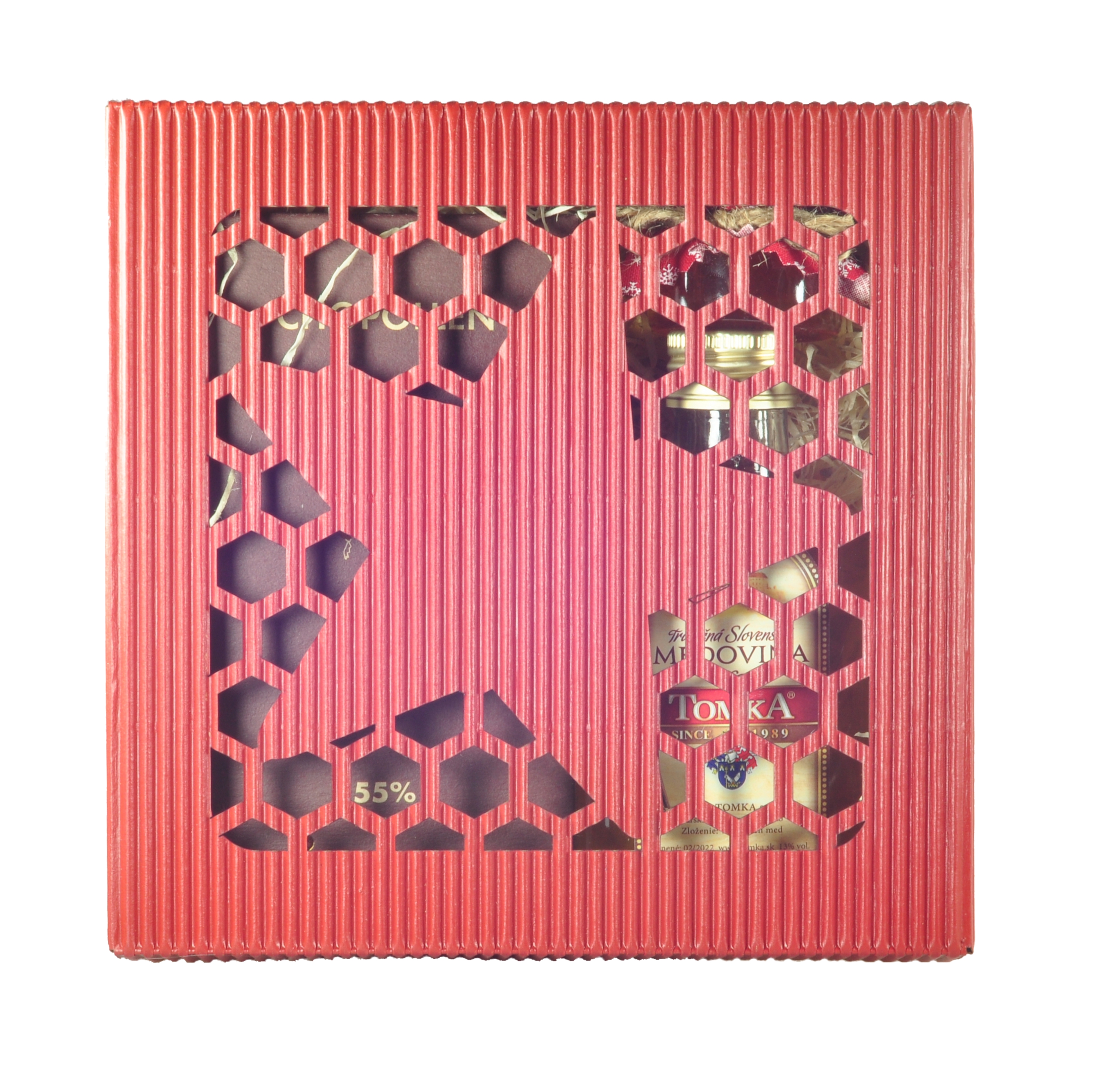 Kazeta obsahuje: tradiční medovina slovenského výrobce TOMKA, zrající v dubových sudech 0,1l, čokoláda s včelím pylem 75g, med od včelaře 40g ve sklenici s textilní dekorací - barva dle výběru zákazníka. Kazeta je z papírové lepenky KRAFT s okénkem s voštinovým motivem podlepeným transparentní fólií a vystlaná dřevěnou vlnou. Komplimentka papírová vložená v kazetě. Všechny produkty původem ze Slovenska. Rozměr: 185x185x50mm. Váha: 240g