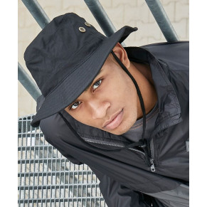 Široká, plochá krempa, patentky na boční straně pro připevnění ke krempě, 8 ozdobných švů na krempě, páska se zarážkou, po stranách 4 kovová očka, nesmí se prát, nelze žehlit, nelze sušit v sušičce, nelze chemicky čistit.