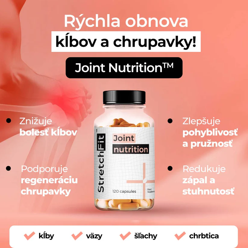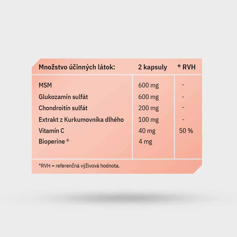 Komplexní výživa pro podporu zdraví kloubů, chrupavek a pohybového aparátu. Pomáhá zmírnit nepříjemné pocity při pohybu, podporuje pružnost a regeneraci. Vhodná při zvýšené zátěži, sportování i v období stárnutí. Složení: glukosamin sulfát, metylsulfonylmetan (MSM), chondroitin sulfát, kapsle: hydroxypropylmetylcelulóza, extrakt z kořene Kurkumovníku dlouhého (Curcuma longa), objemové činidlo: mikrokrystalická celulóza, vitamín C (kyselina hořečnatý, Bioperine®.