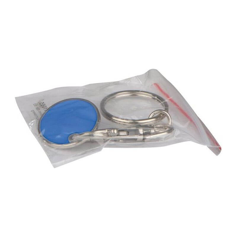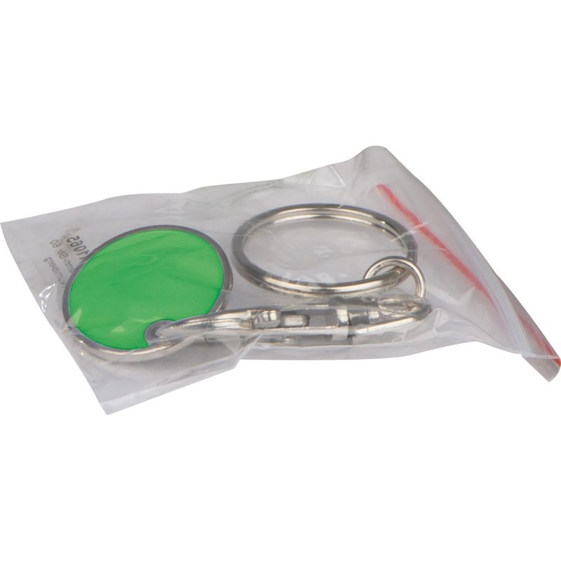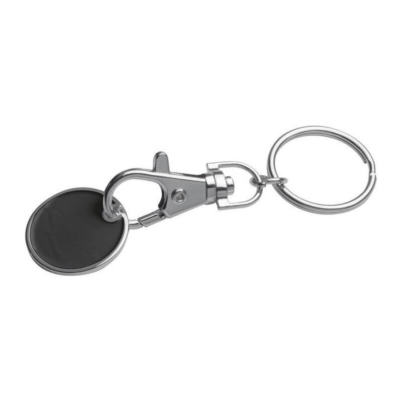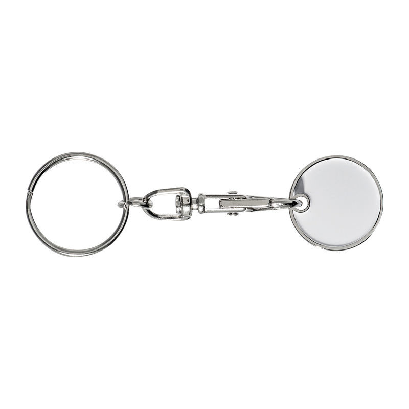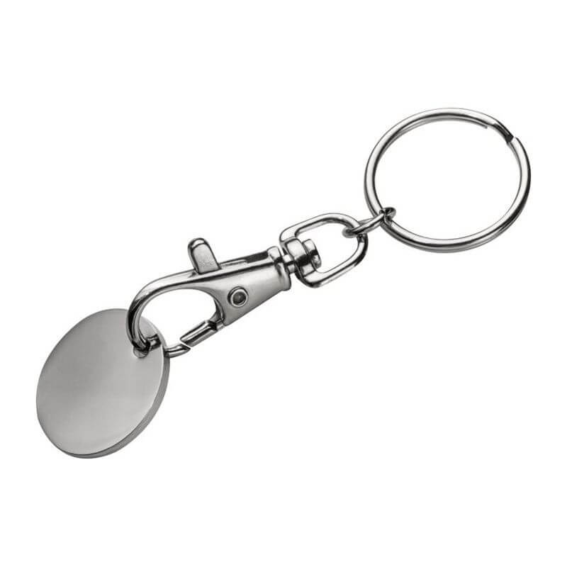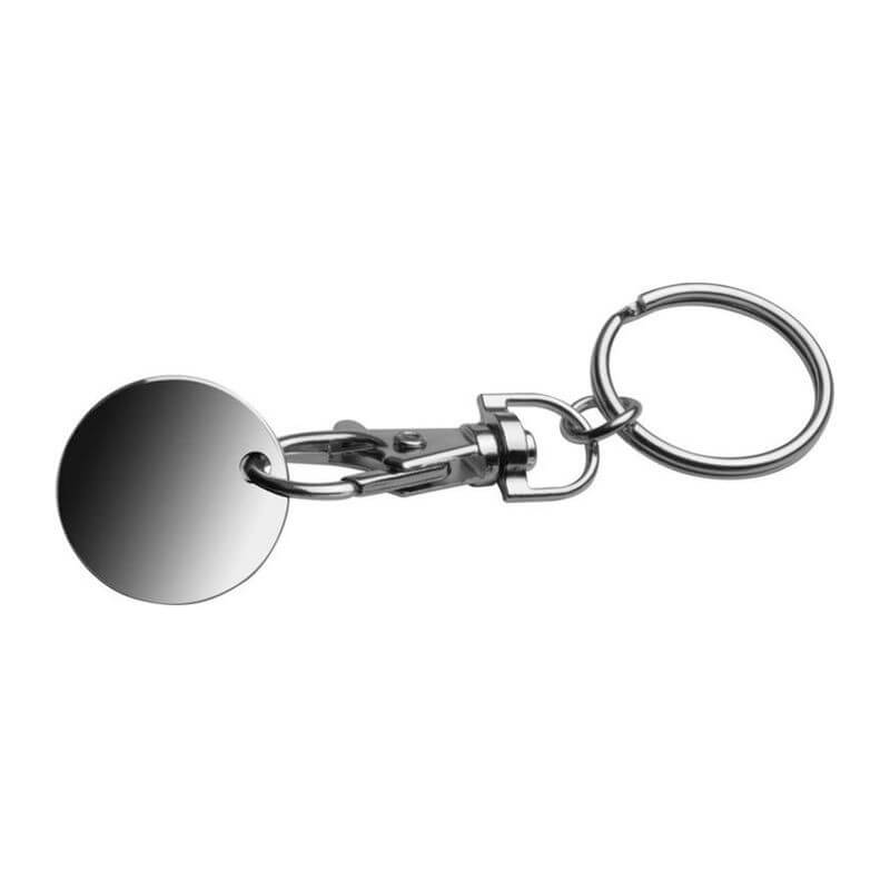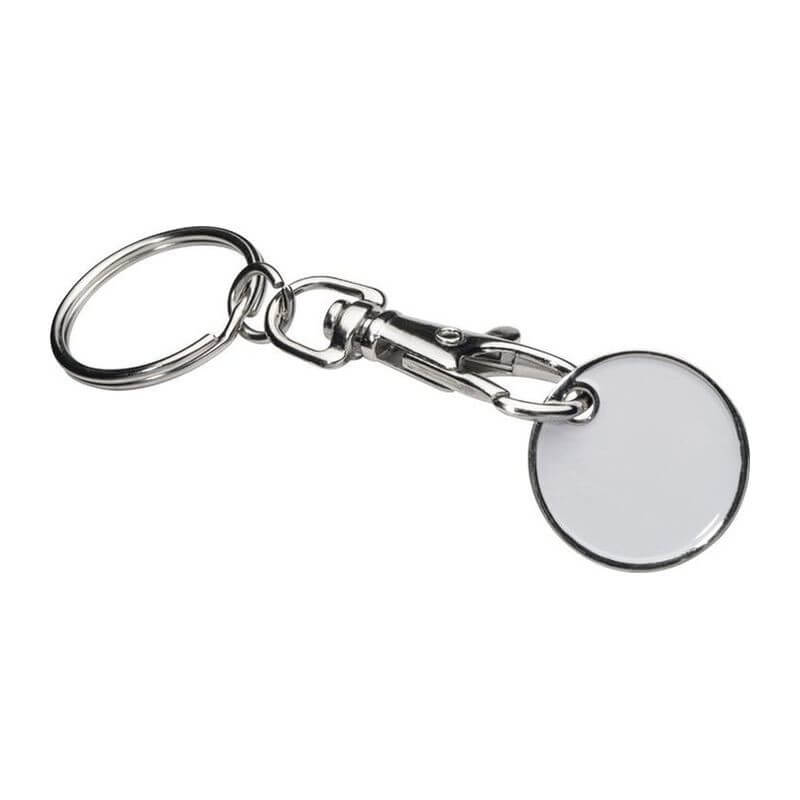 Klíčenka s karabinkou a s odnímatelným žetonem na nákupní vozíky. Mince mají na jedné straně bílou barvu, což znamená ideální místo pro Vaše logo. Jako potisk doporučujeme gravírování.