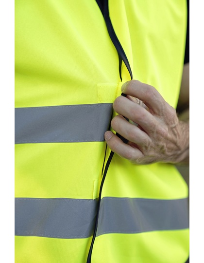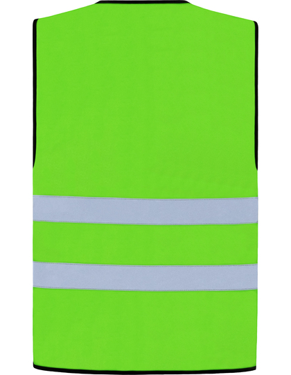 Vysoce kvalitní pohodlná bezpečnostní vesta s extra velkými plochami na potisk. Signální žlutá a signální oranžová: EN ISO 20471:2013/A1:2016, neonově zelená: EN 17353:2020 typ AB3. S černými švy na lemu ve stylu Korntex. Dva příčné reflexní pásy. Velikost nastavitelná pomocí dvou suchých zipů. Výrobce zaručuje reflexní vlastnosti v souladu s normou EN pro 25 praní při 40 °C.. Návod k použití ve 24 úředních jazycích EU. Vybaveno čárovým kódem EAN. Jednotlivě balené v polyetylenových sáčcích.