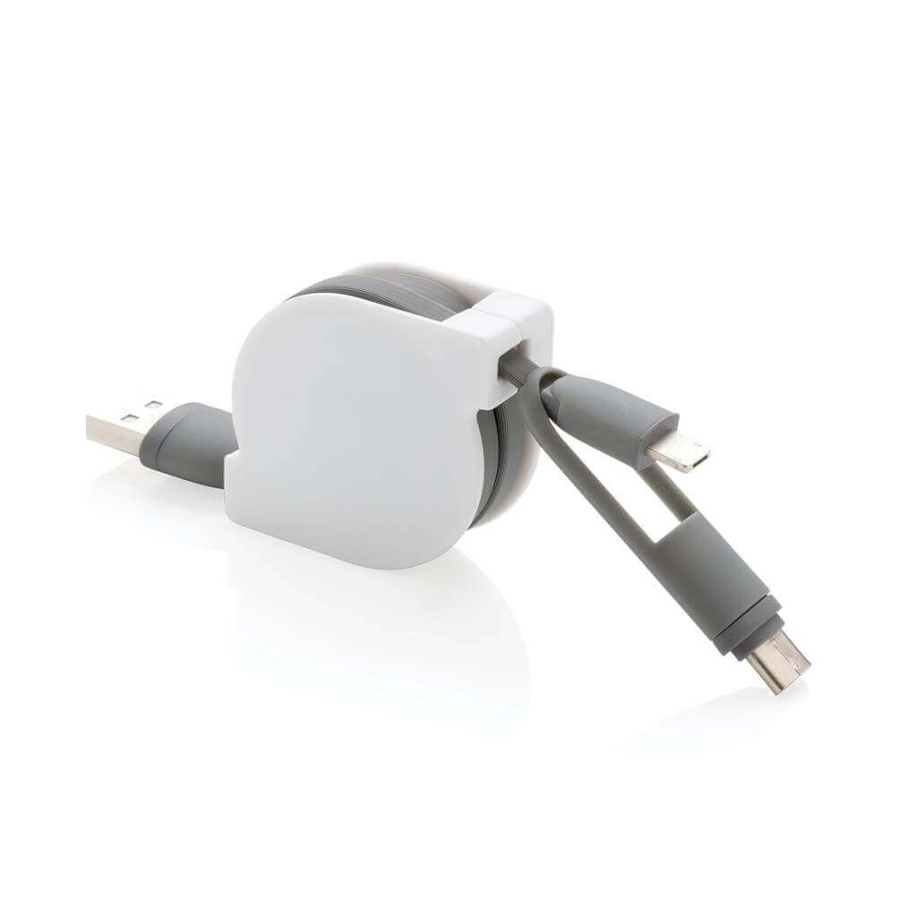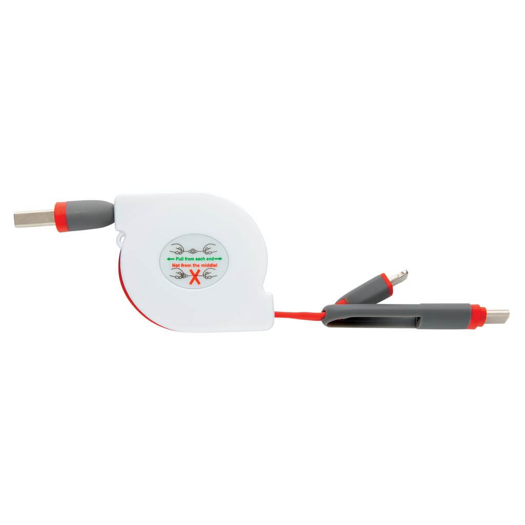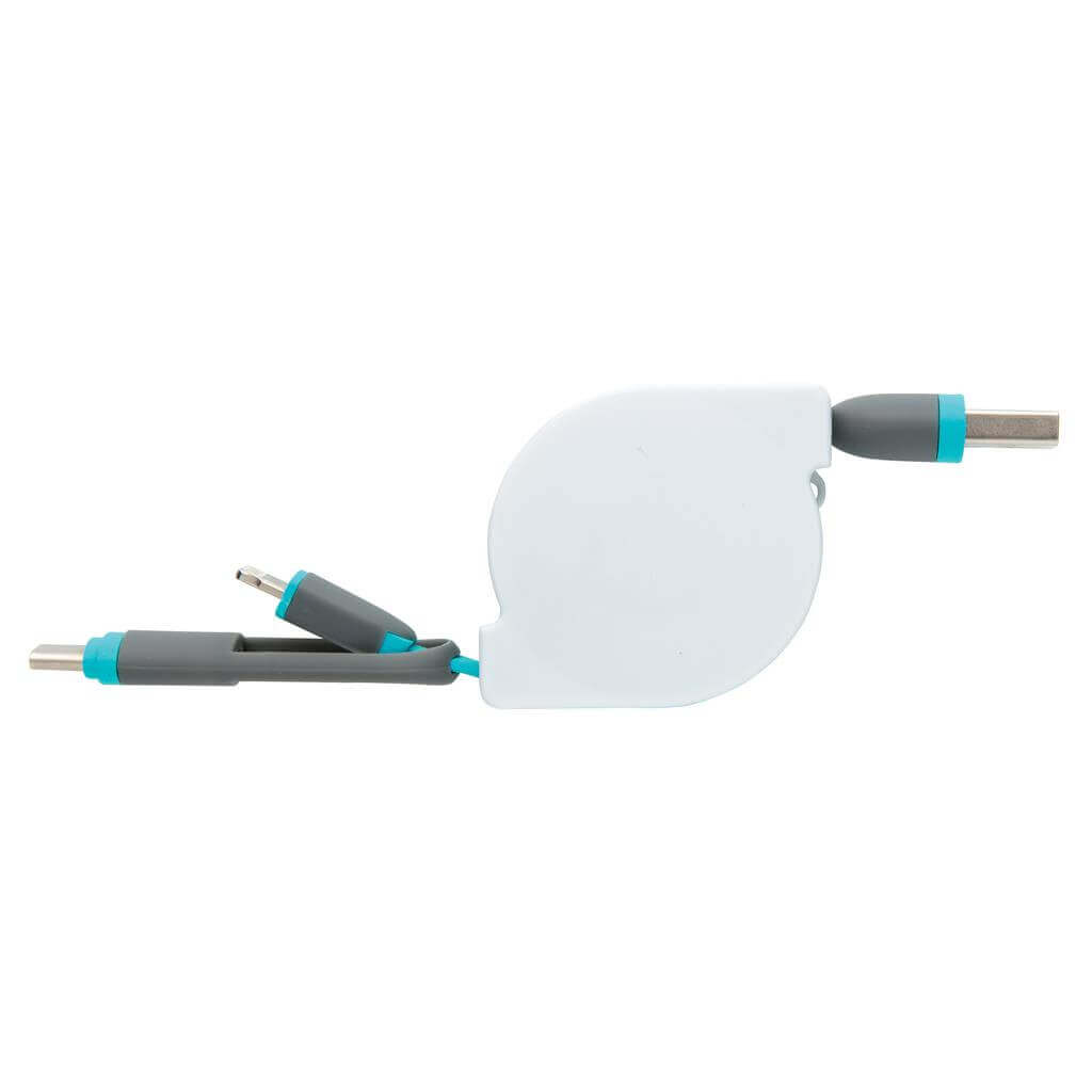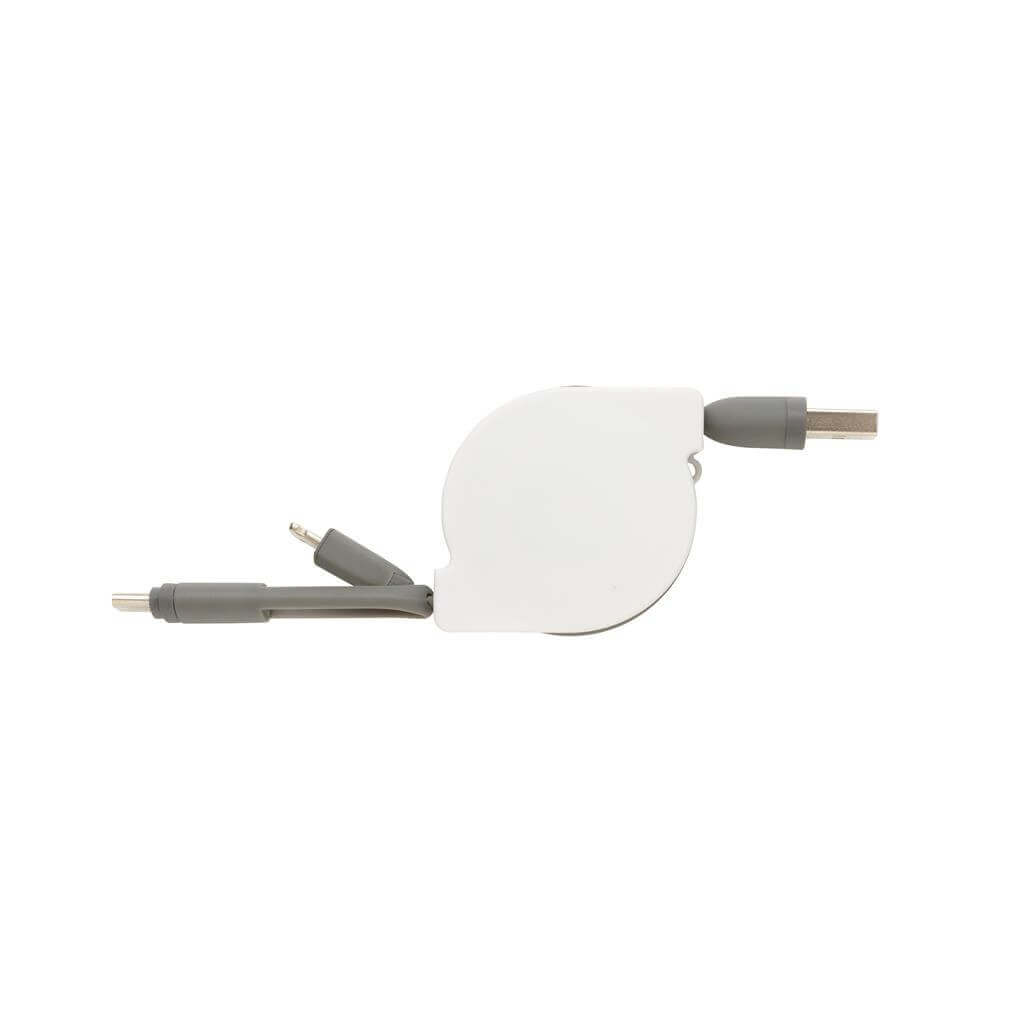 Kompaktní nabíjecí kabel 3 v 1 obsahující konektory USB typu C a dvojitý konektor pro zařízení s iOS nebo Android využívající micro USB. Díky svinovacímu mechanizmu je 1m dlouhý kabel skladný a vhodný na cesty. Pouzdro z ABS, bužírka kabelu z TPU. Pro nabíjení i synchronizaci dat.