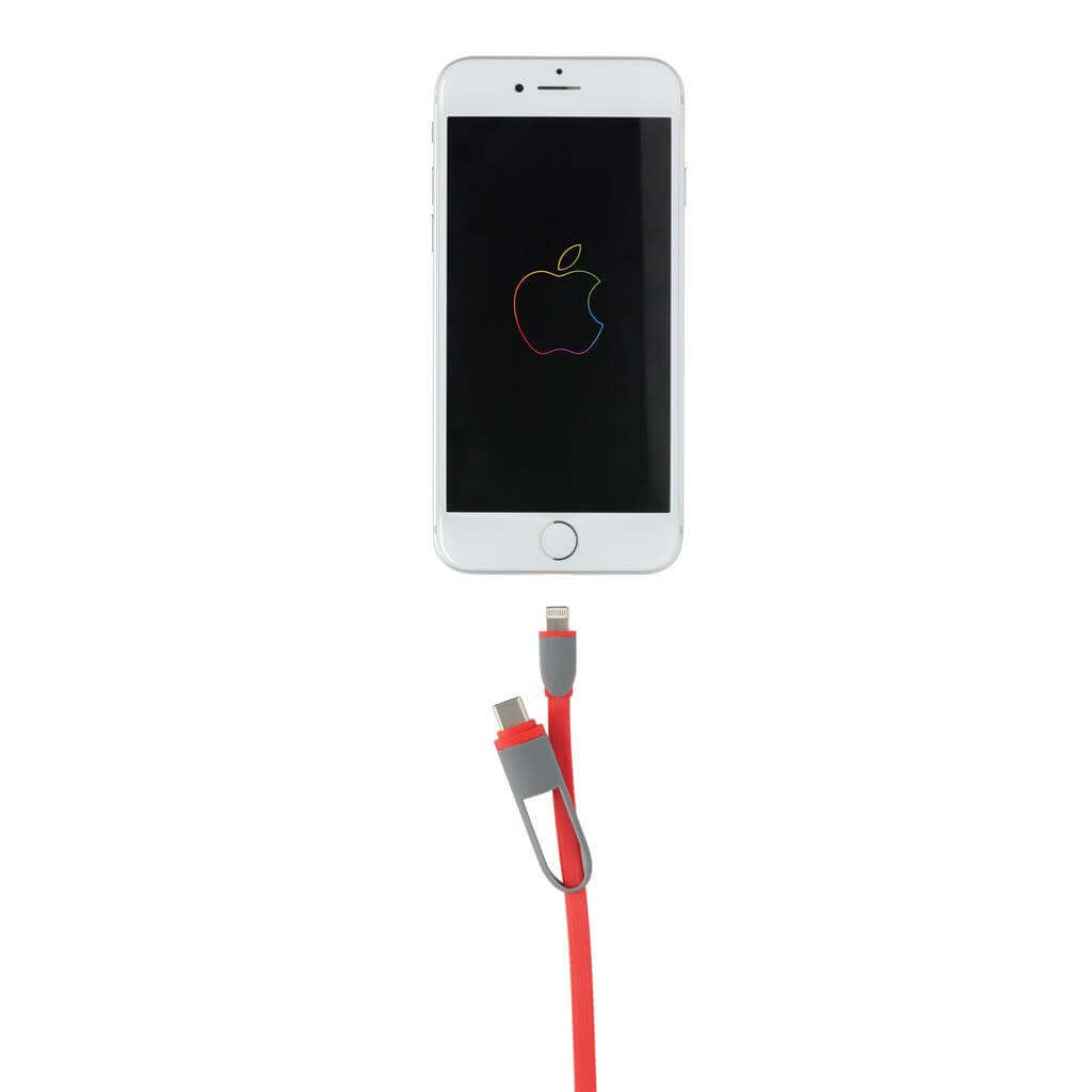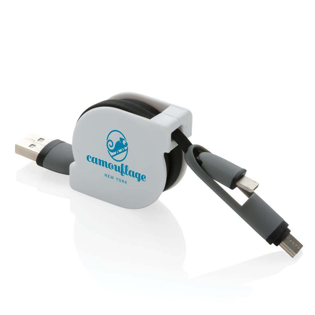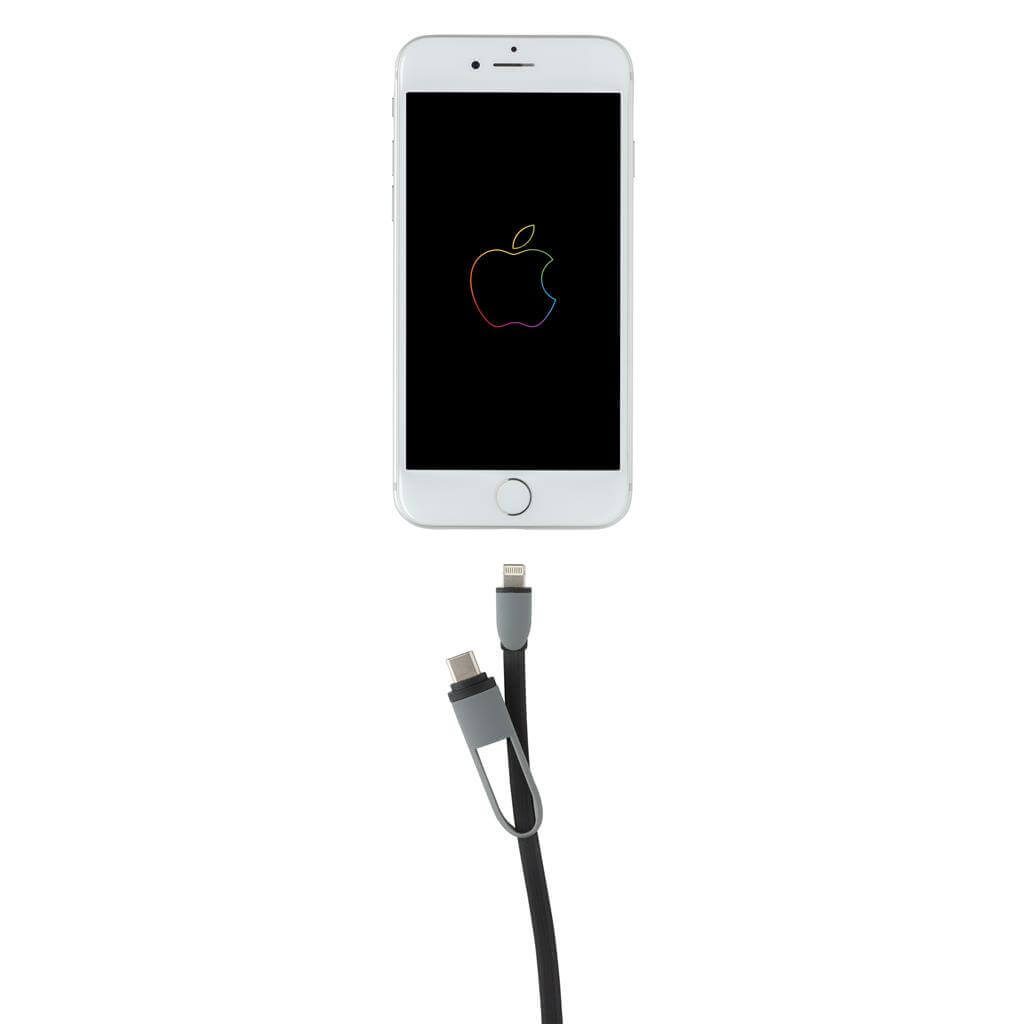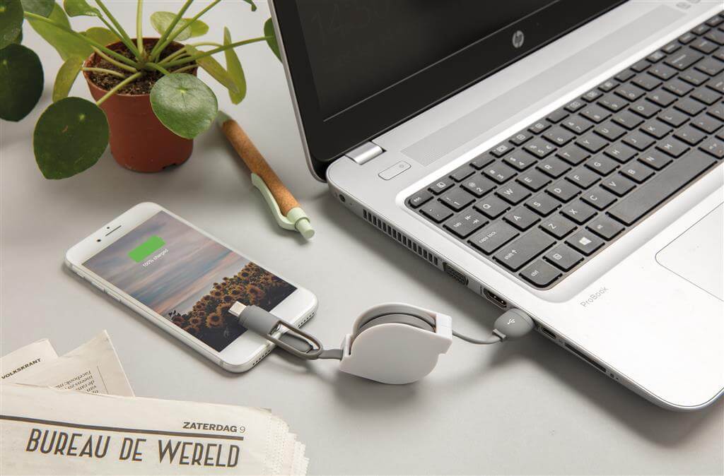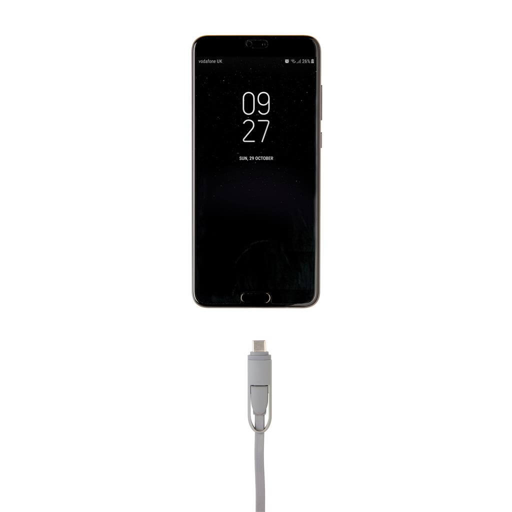 Kompaktní nabíjecí kabel 3 v 1 obsahující konektory USB typu C a dvojitý konektor pro zařízení s iOS nebo Android využívající micro USB. Díky svinovacímu mechanizmu je 1m dlouhý kabel skladný a vhodný na cesty. Pouzdro z ABS, bužírka kabelu z TPU. Pro nabíjení i synchronizaci dat.