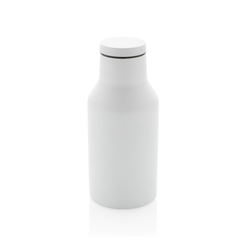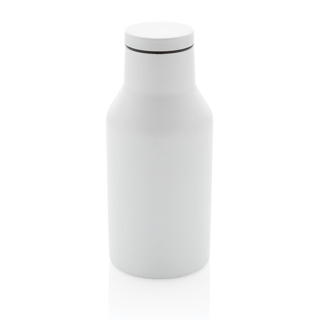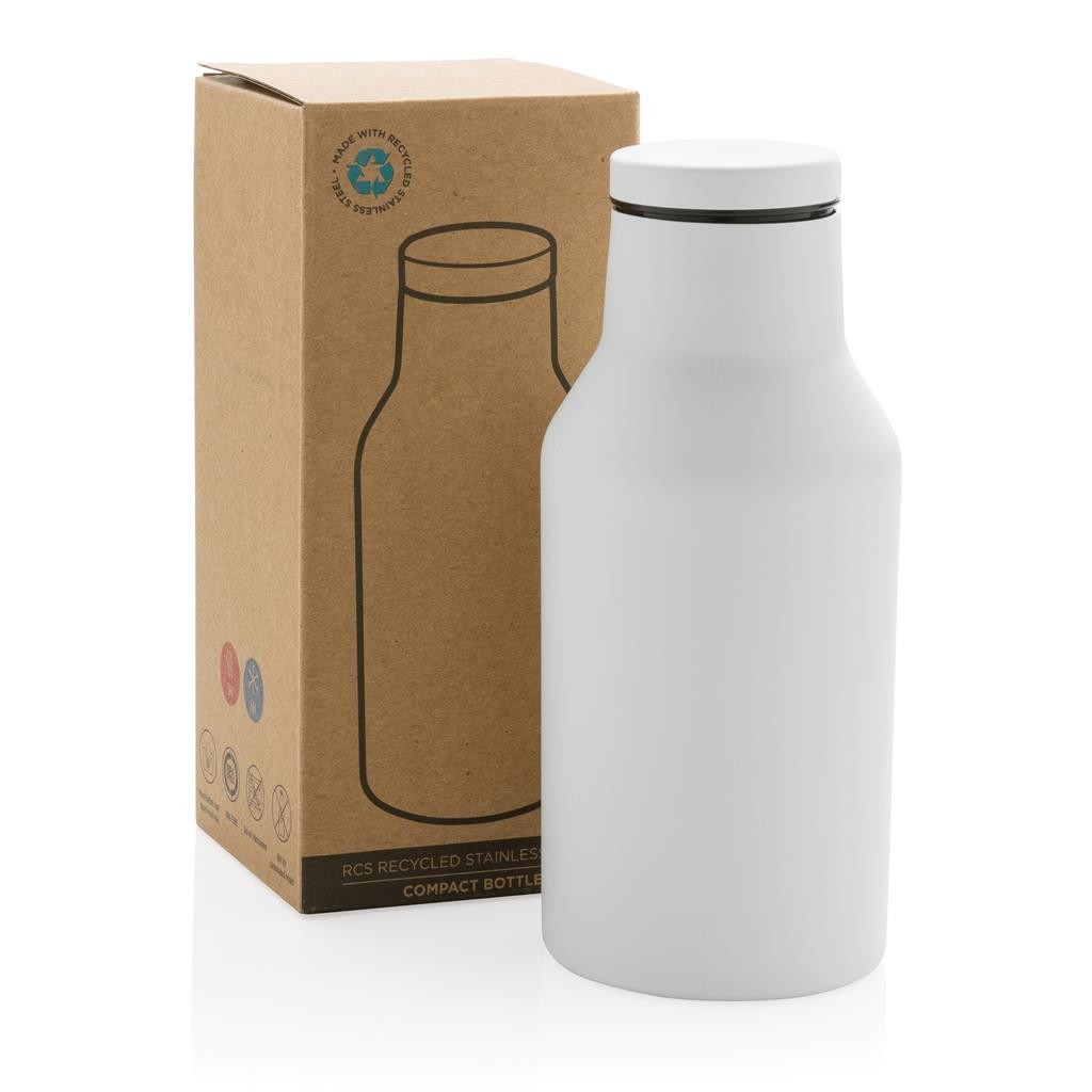 Kompaktní nepropustná termo lahev s bezpečným šroubovacím uzávěrem s širokým hrdlem pro snadné čištění a plnění. Dvoustěnná vakuová izolace uchová nápoj horký po dobu až 3h a studený až 6h. Vyrobeno z RCS recyklované nerezavějící oceli. RCS (Recycled Claim Standard) je globální standard, který umožňuje ověřit použití recyklovaného materiálu v produktu napříč celým dodavatelským řetězcem. Podíl použitého recyklovaného materiálu vzhledem k celkové váze produktu: 89 %. Bez BPA. Objem: 300 ml. Baleno v FSC kraftové krabičce.