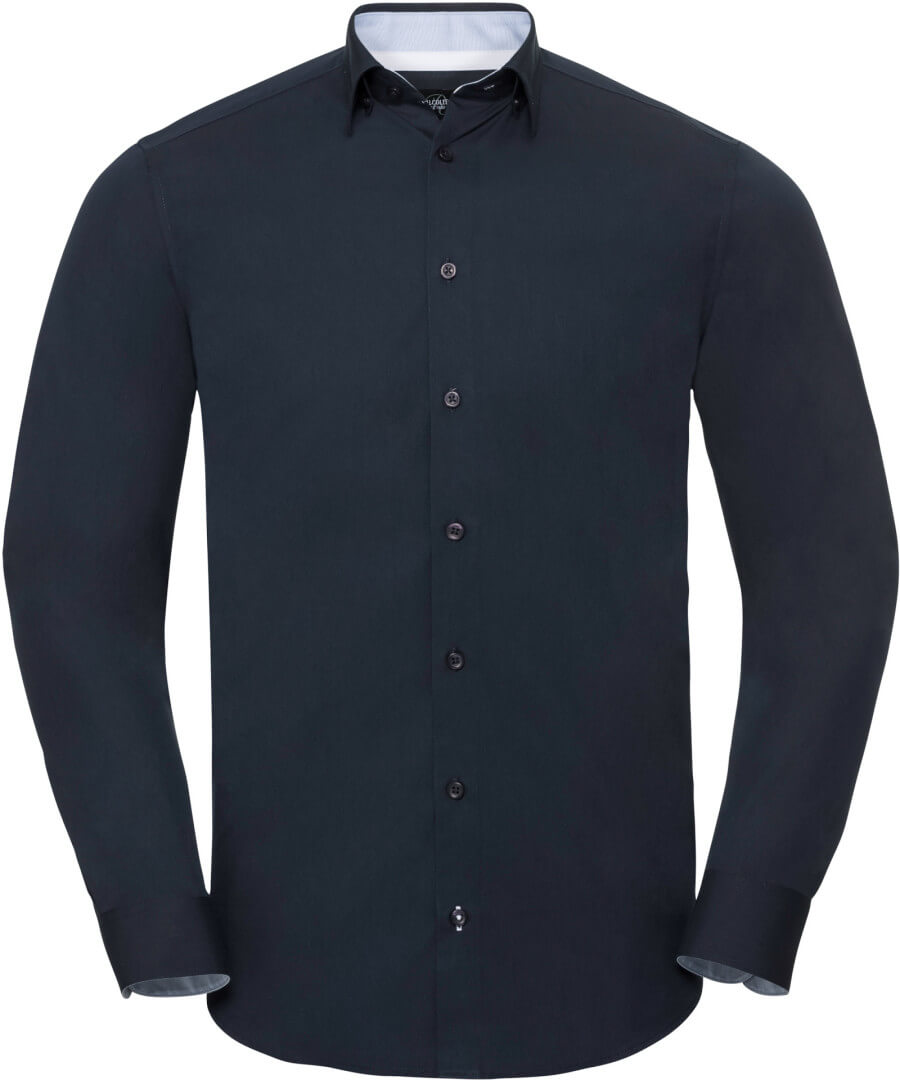 130g/m², 75% bavlna; 25% lycra® T400® vlákno Projmutý delší střih, límeček se spodními knoflíčky, úzká léga, dvoubarevné kontrasty uvnitř na manžetách a límci, nastavitelné manžety se 2 knoflíky, kontrastní barvy na knoflíkové dírce, zaoblený dolní lem, snadná péče, dobře odvádějící vlhkost, lze suš