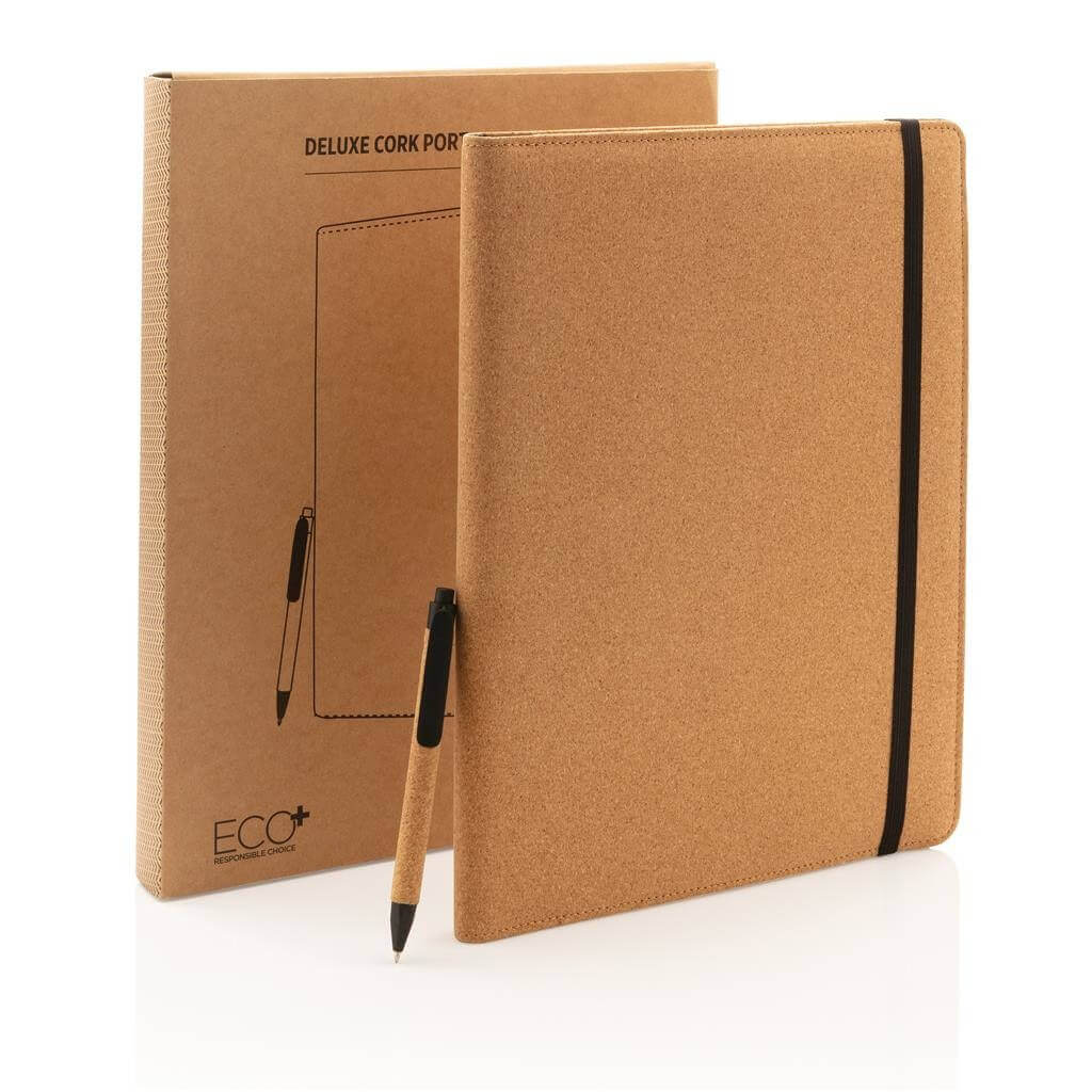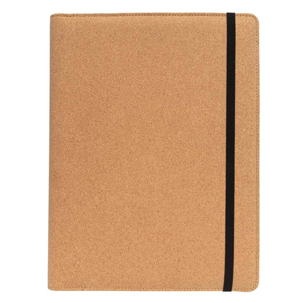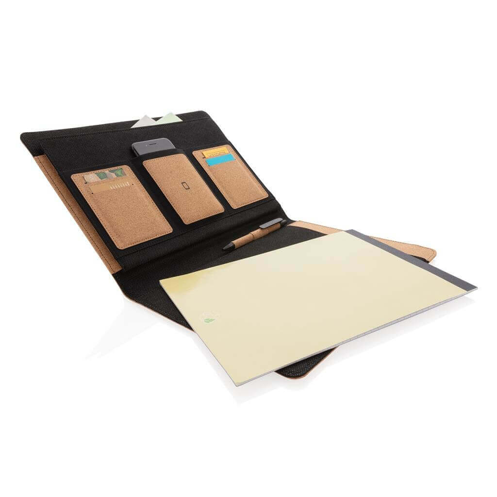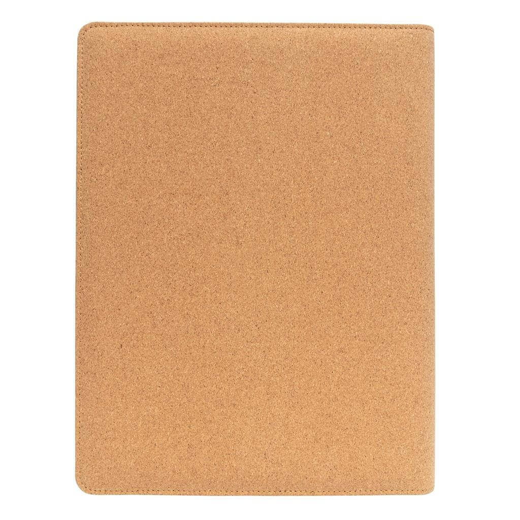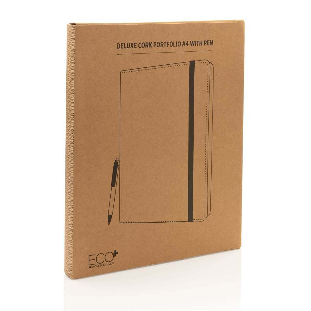 Prémiové korkové portfolio A4 s elegantními černými detaily. Ladící poznámkový blok s 20 listy/40 stranami recyklovaného krémového linkového papíru o gramáži 80g/m2, pero z kombinace korku a pšeničné slámy a gumička. Vnitřní část obsahuje velkou kapsu, kapsu na mobil, 2 dodatečné menší kapsy, 4 sloty na karty a poutko na pero. Baleno v kraftové dárkové krabičce.