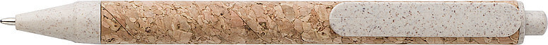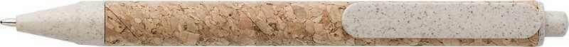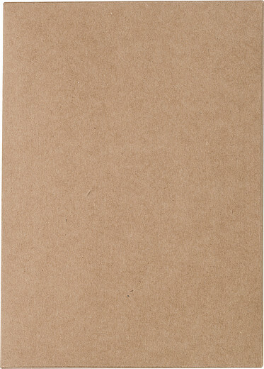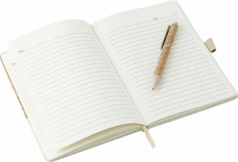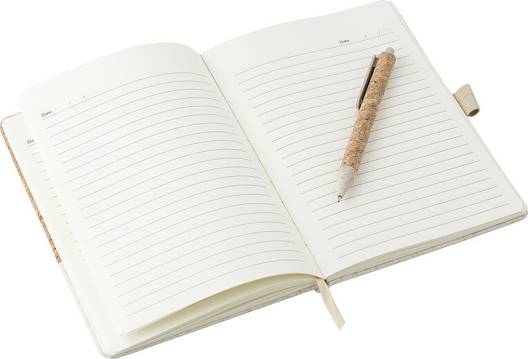Korkový a lněný sešit a kuličkové pero z korkové a pšeničné slámy v Kraftovy papírové krabičce. Zápisník má elastické očko na pero a 80 listů podšitého papíru s upozorněním na datum. Kuličkové pero má modrý inkoust.