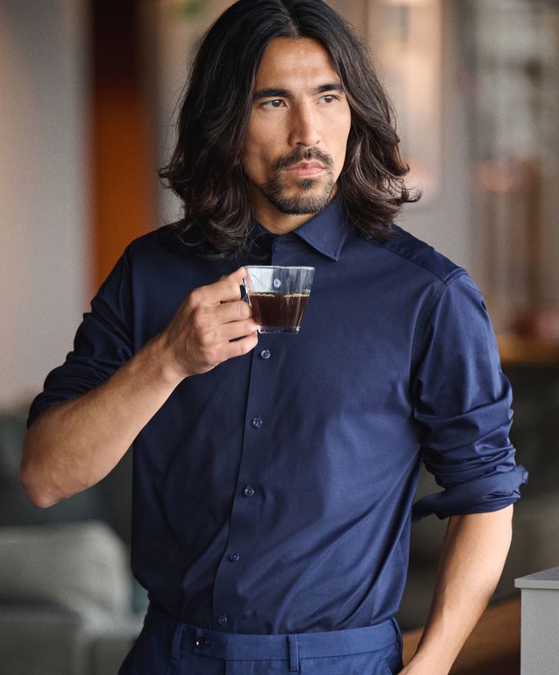 Střih Slim Fit, skrytý button-down límec typu cutaway, sedlo, nastavitelné manžety se 2 knoflíky, záševky na zádech, pružný materiál, tkanina pro snadnou údržbu, vyrobeno z dlouhovlákné bavlny, pratelné na 40°, snadné žehlení, nelze sušit v sušičce