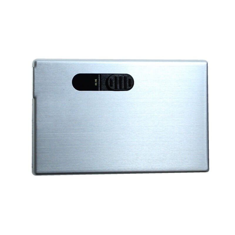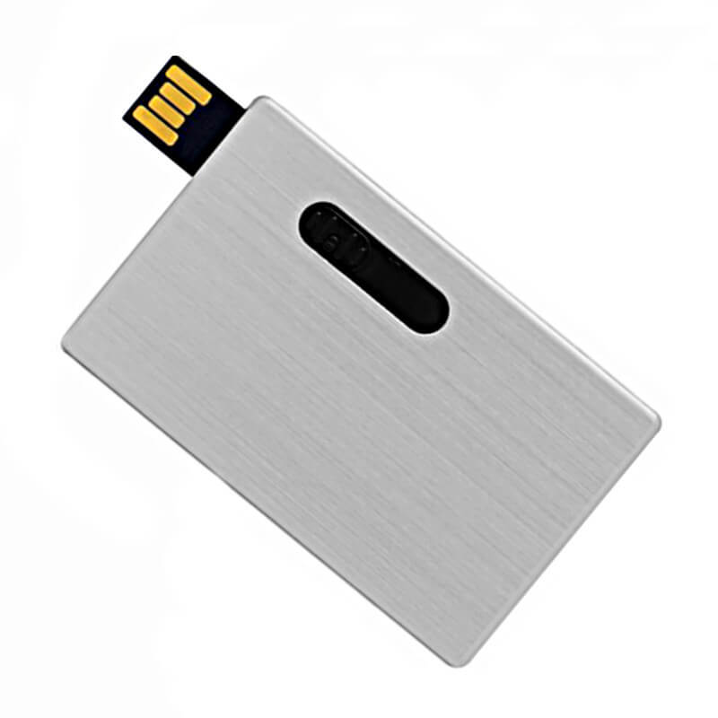 Tenká kovová USB karta s výsuvným konektorem. Díky formátu kreditní karty disponuje velkou plochou pro potisk, takže může sdělit velké množství informací jak na povrchu, tak uvnitř. Ideální na prezentace, veletrhy, konference, apod. Kromě klasického gravíru laserem a tampon tisku na ni tiskneme i plnobarevně (CMYK)