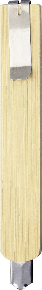 Kovový zalamovací nůž s bambusovým tělem. Na zadní straně je kovový klip pro připevnění nože, když se nepoužívá. Čepele jsou vyrobeny z uhlíkové oceli. Jednotlivě baleno v recyklovaném polyetylénovém sáčku.Rozměry: 1,8 x 13 x 1,4 cm