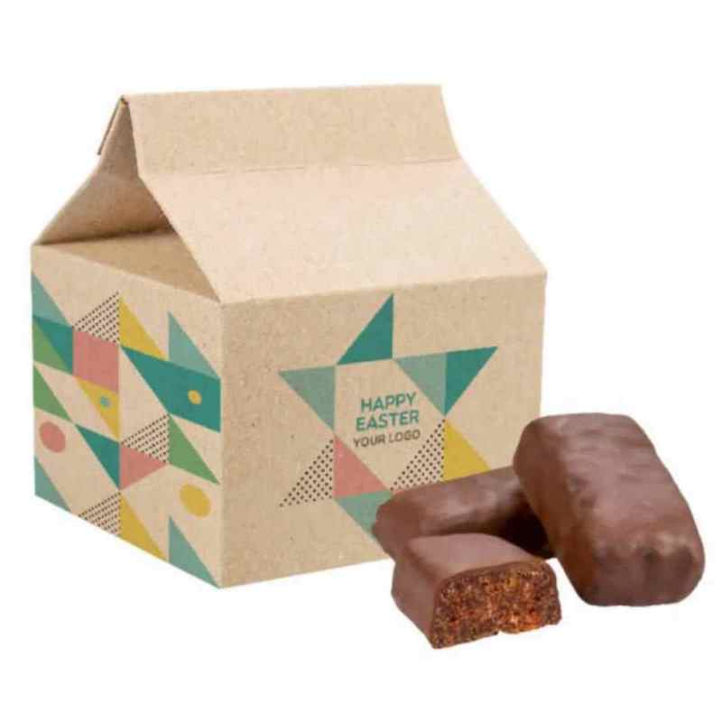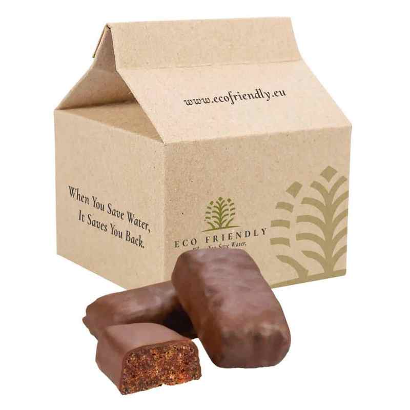Mini datlové tyčinky tajně ukrývají sušené švestky a křupavé vlašské ořechy. Každý se koupal v dezertní čokoládě. Zdravá pochoutka nabízí také významné možnosti personalizace balení.