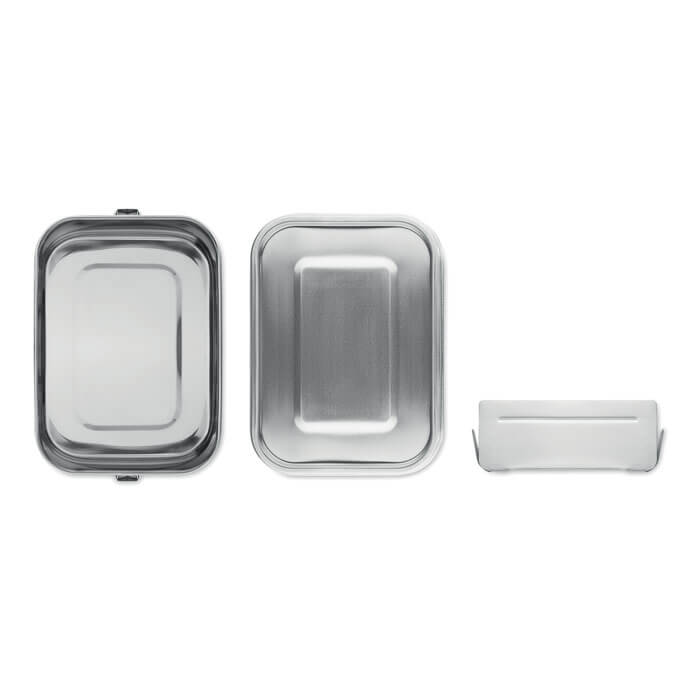 Krabička na oběd z nerezové oceli s pevnými a bezpečnými bočními přezkami. Včetně vnitřní přepážky. Objem: 1200 ml. Vezměte si s sebou do práce nebo na piknik zdravý a doma připravený oběd v tomto odolném nerezovém boxu. Přezky na boku zajistí, že víko zůstane na cestách. Díky rozdělovači je snazší oddělit jídlo, aniž by se pomíchalo.