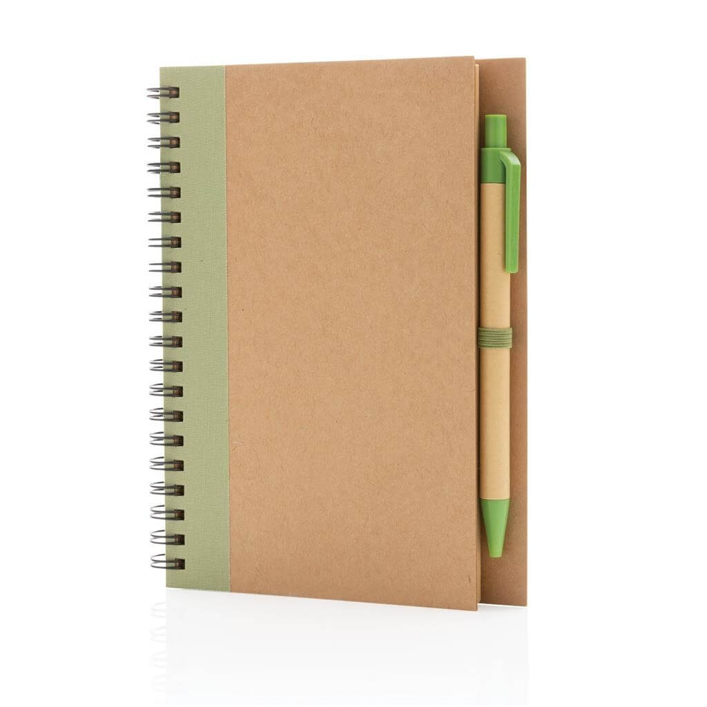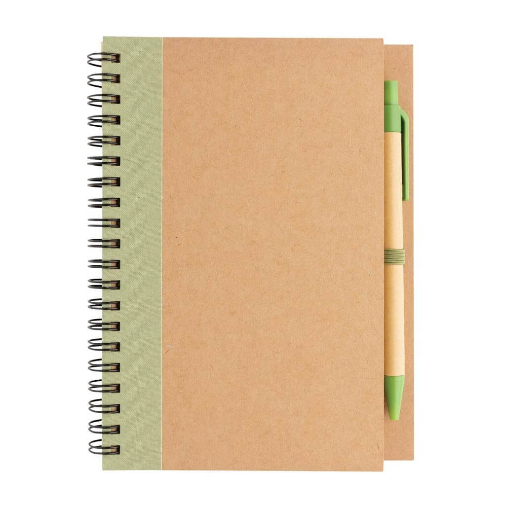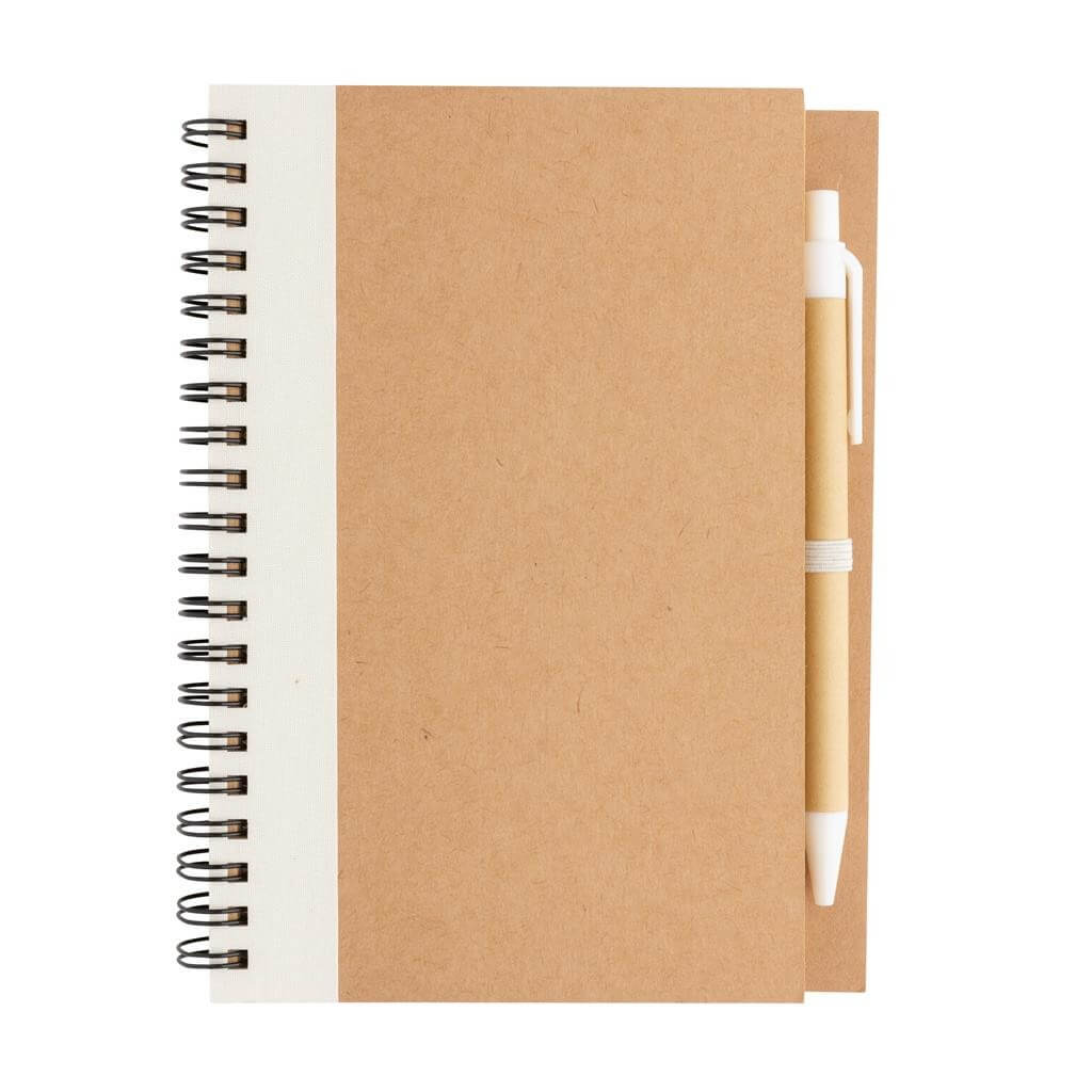 Poznámkový blok s kroužkovou vazbou a obalem z kraftového papíru. Obsahuje 70 listů/140 stran krémového recyklovaného linkovaného papíru o gramáži 70 g/m2. Včetně pera v ladící barvě s modrým německým inkoustem Dokumental pro psaní až 600m textu.