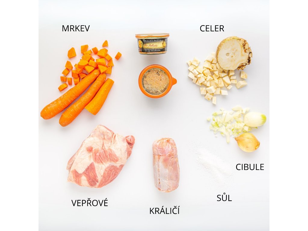 Složení: králičí maso 72%, vepřové maso, zelenina (mrkev, celer, cibule), sůl, pepř