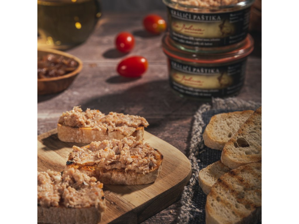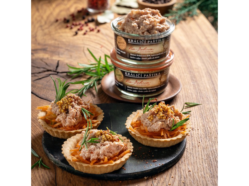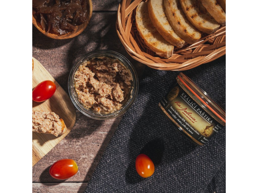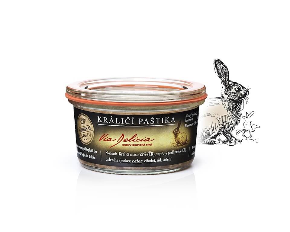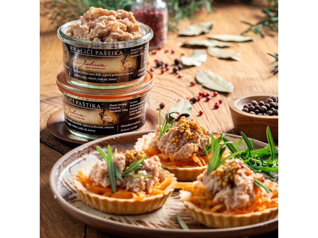 Lahůdková záležitost - pečený králík, trošku vepřového masa, čerstvá zelenina, sůl a pepř. Neobsahuje lepek, konzervanty ani barviva. Používáme čerstvé králičí maso z českých chovů.