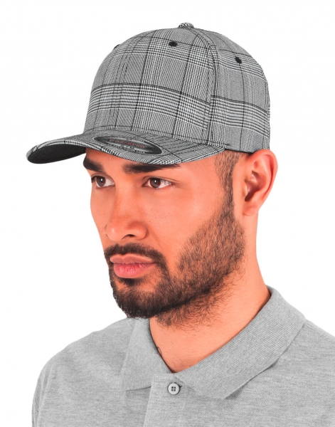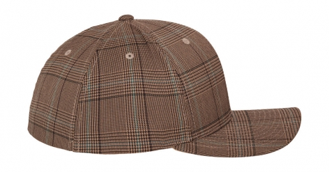 240 g/m², 97% polyester, 3% elastan, vzor Glen check, 6-panelová kšiltovka, strukturovaný povrch, vrchol s osmi řadami prošívání, černý podhled pro Black/White, khaki podhled pro Brown/Khaki, uzavřená zadní část, elastická .