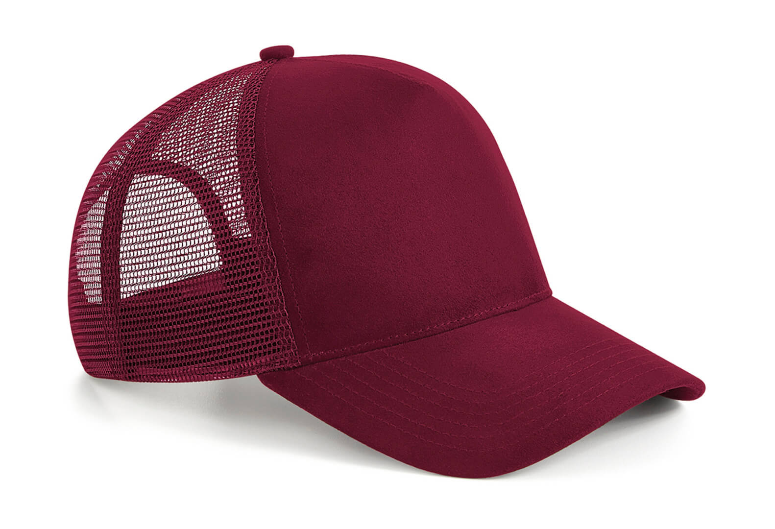 Přední a vrchní část: 100% polyester (semišový vzhled) · Zadní panely: 100% polyester (síťovina) · 5dílná · šestinásobná prošívaná špička · Předkřivený vrchol · Plastové uzavírání spony