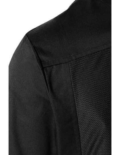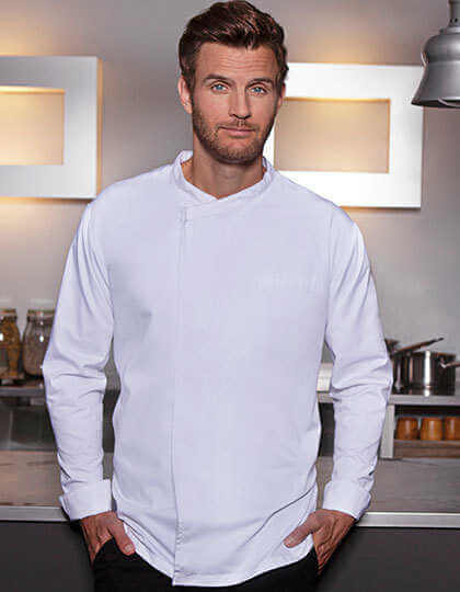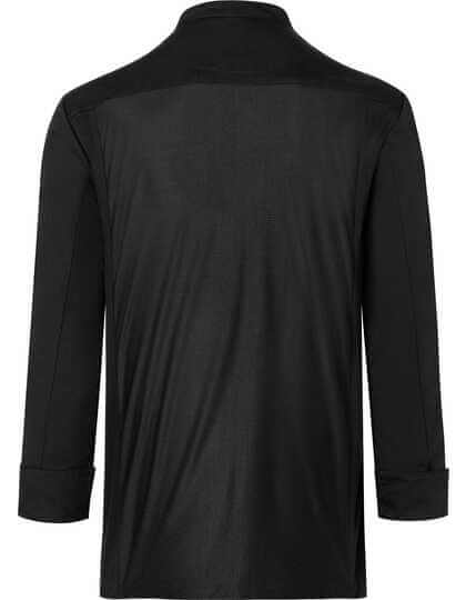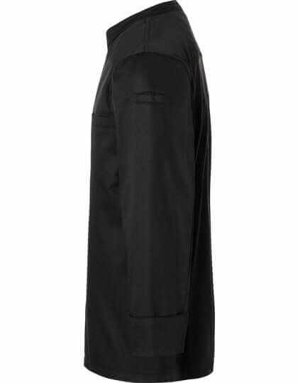 Přední díl: Materiál hlavní části: 65 % polyester / 35 % bavlna, 200 g/m² | Zadní díl: Žerzej, 100 % polyester, prodyšný, regulující vlhkost | Stylový kuchařský rondon přes hlavu s dlouhými rukávy | Žerzejová vložka na zadní straně (síťovinová struktura) zajišťuje maximální pohodlí a větrání | Rovný střih | Skrytý díl s patentkami | Košili lze rozšířit pomocí patentek, aby se snadněji oblékala | Rovné manžety s rozparkem pro ohrnování | Lemovaná kapsa na levé straně hrudi | Lemovaná kapsa na levém rukávu