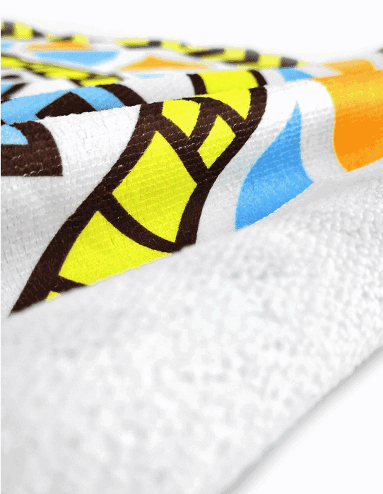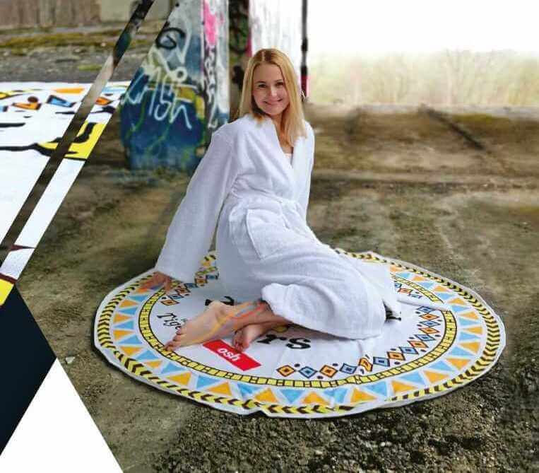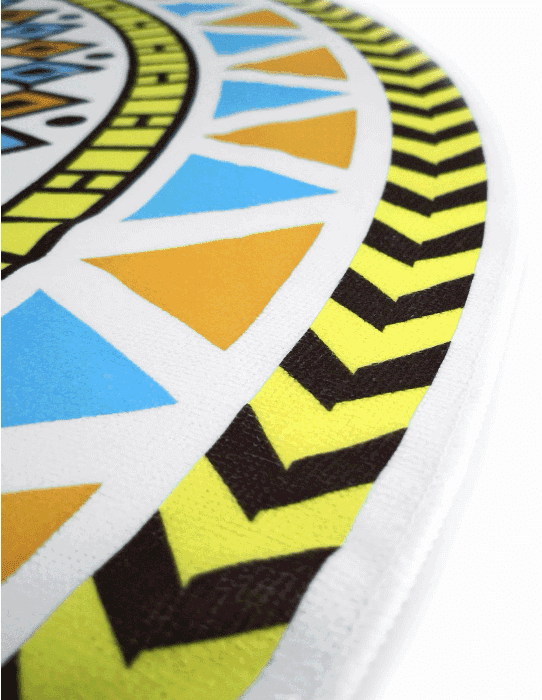 Stále oblíbenější kulaté ručníky. Neobvyklý, originální střih ručníku, který zaujme. Kulatý ručník tvoří z vrchní strany polyesterové vlákno vhodné pro sublimační tisk různobarevných motivů. Spodní strana vyrobená z kvalitní bavlny má vynikající savé vlastnosti. Okraj ručníku lze doplnit vkusnými třásněmi.