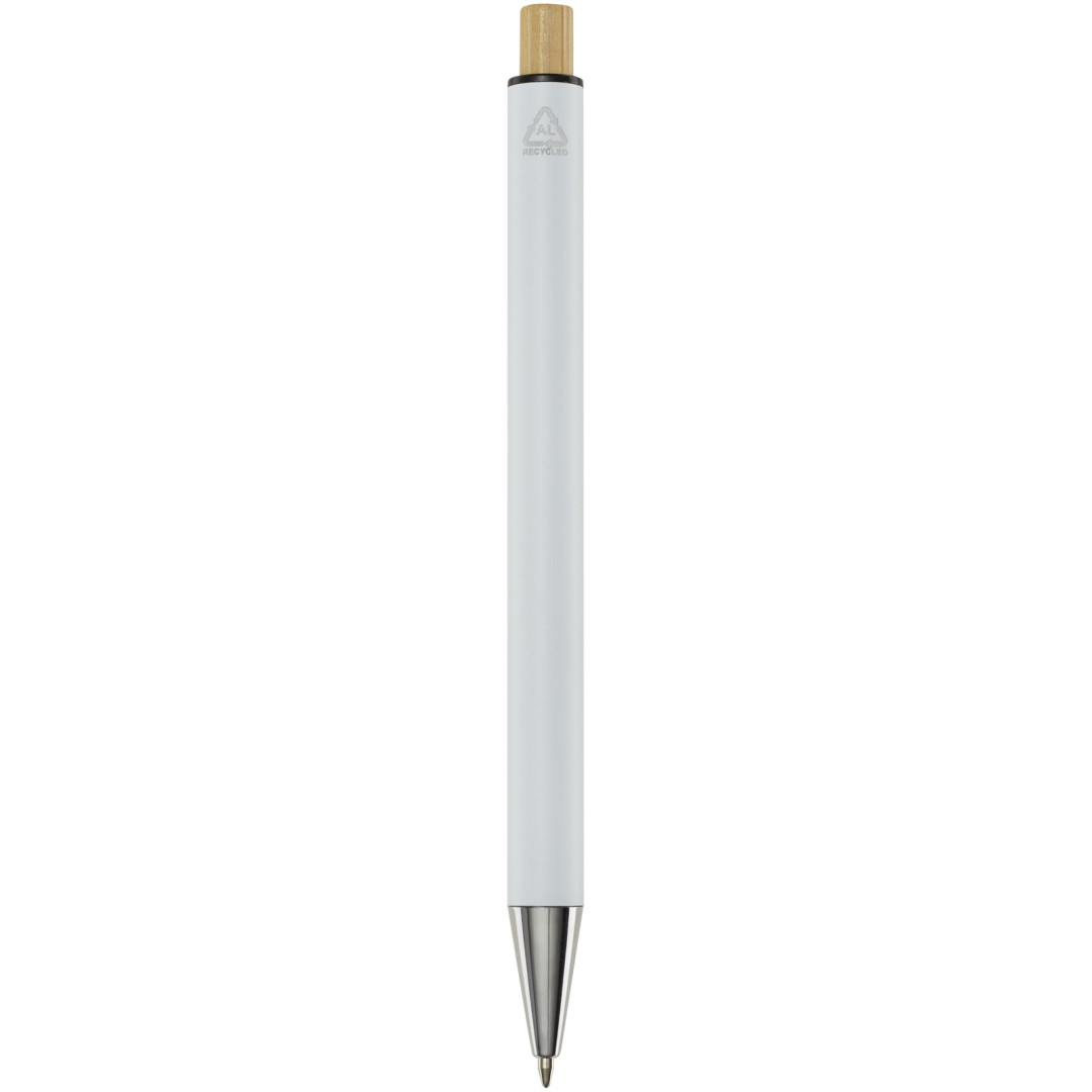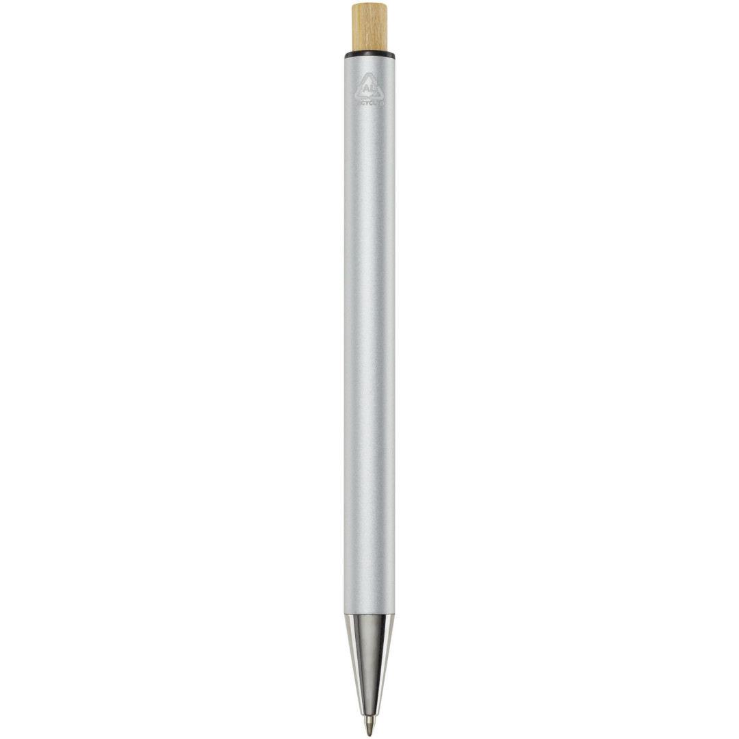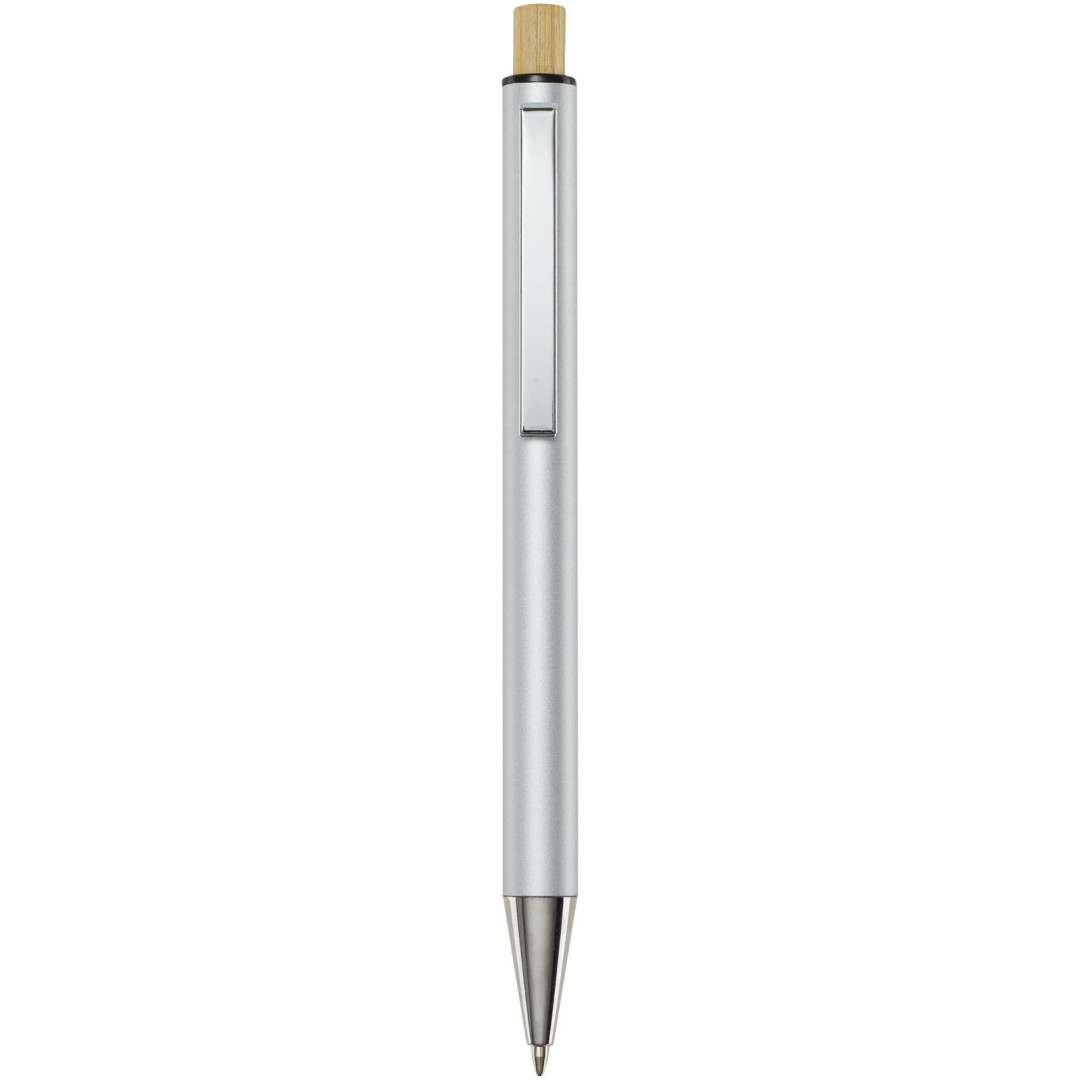 Kuličkové pero Cyrus je vyrobeno z recyklovaného hliníku, což vyžaduje méně energie než výroba hliníku z nerostných surovin. Snižuje také množství odpadu na skládkách a pomáhá šetřit přírodní zdroje s cílem snížit emise skleníkových plynů. Tlačítko je vyrobeno z bambusu. Barva inkoustu: Modrá. Délka psaní: 800 metrů. Rozměr hrotu: 1,00 mm.