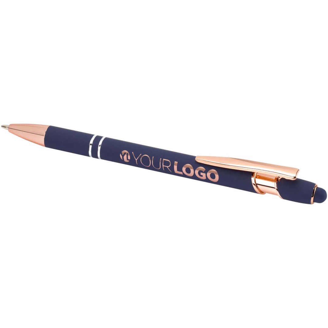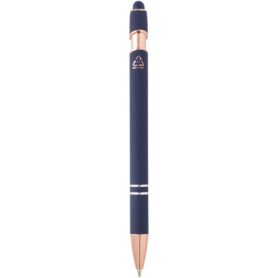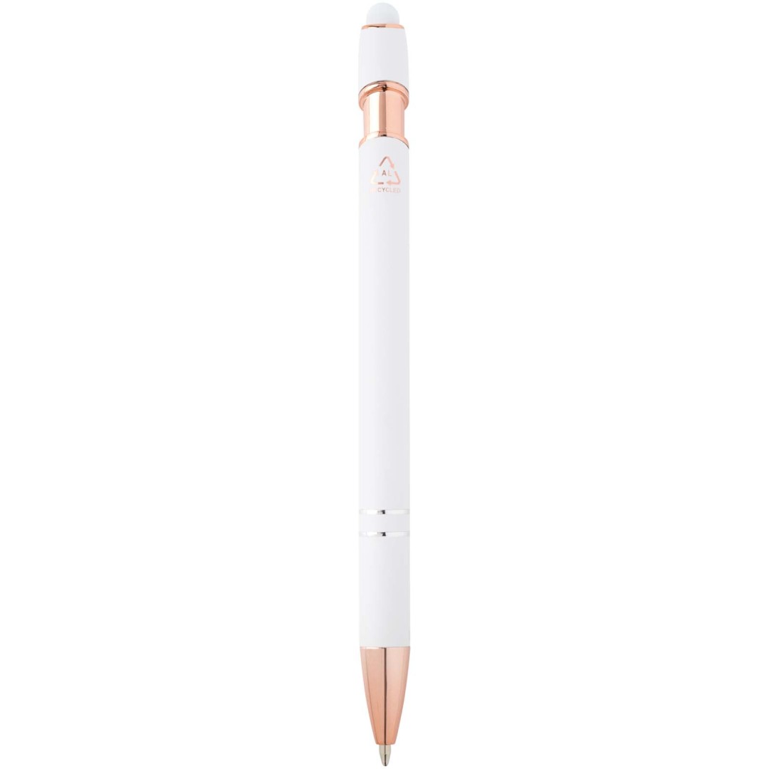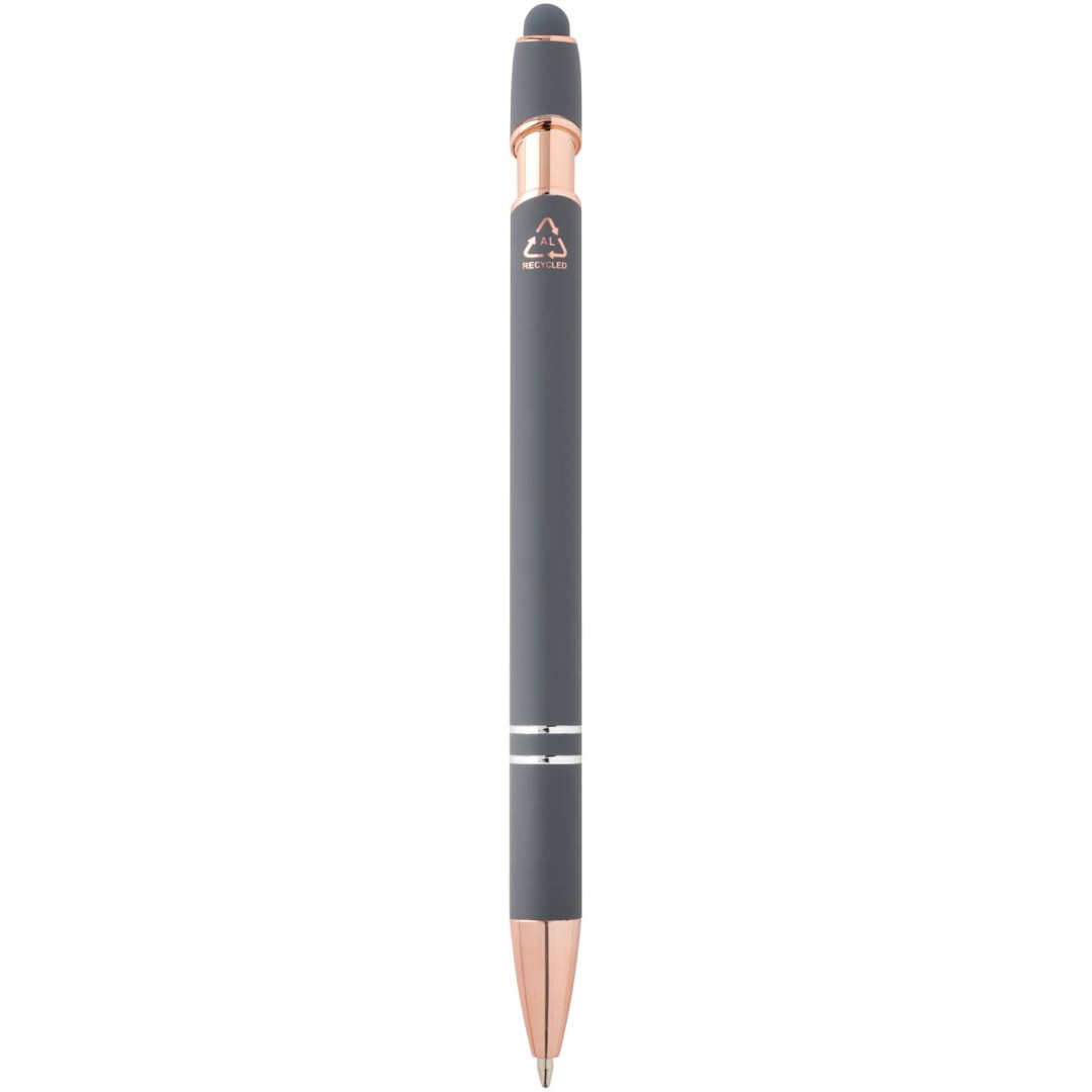 Kuličkové pero Nanna s povrchovou úpravou z růžového zlata má tělo vyrobené z recyklovaného hliníku a dotykový stylus vyrobený ze silikonu. Snižuje také množství odpadu na skládkách a pomáhá šetřit přírodní zdroje s cílem snížit emise skleníkových plynů. Barva inkoustu: Černá. Délka psaní: 800 metrů. Rozměr hrotu: 1,0 mm.
