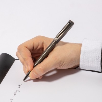 Kuličkové roller pero Twist má pevný a technický design. Tento psací kus obsahuje sofistikovanou zkroucenou čepičku z tmavého chromu a tělo s vyrytým mřížkovým vzorem pro moderní dojem, který mu dodává kontrastní siluetu.