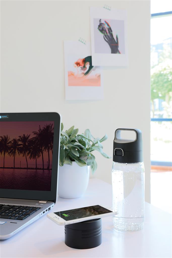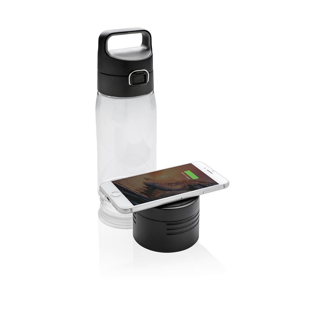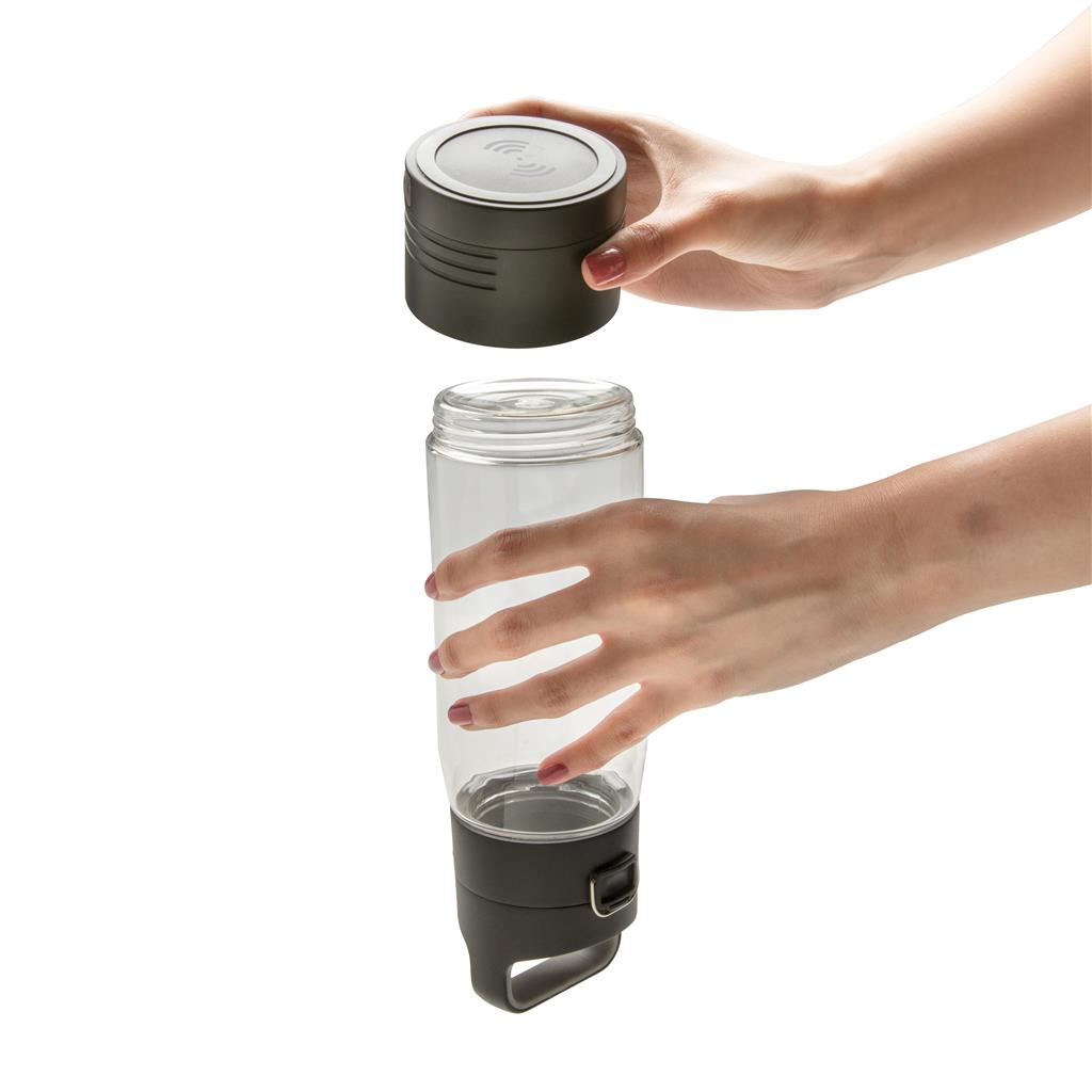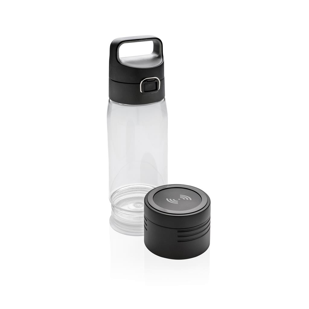 Nepropustná tritanová láhev s uzamykatelným uzávěrem a madlem. V podstavci se nachází 5 000 mAh bezdrátově nabíjející powerbanka. Kompatibilní se všemi zařízeními podporující QI, jako jsou nejnovější generace Android, iPhone 8 a výše. Vstup 5.0V/1.0A. Výstup 5.0V/2.1A. Bezdrátový výstup: 5W. Objem 600 ml. Ochranný vzor® 2 baterií typu Li-poly súčasťou balenia. PMS color 1: Transparent
