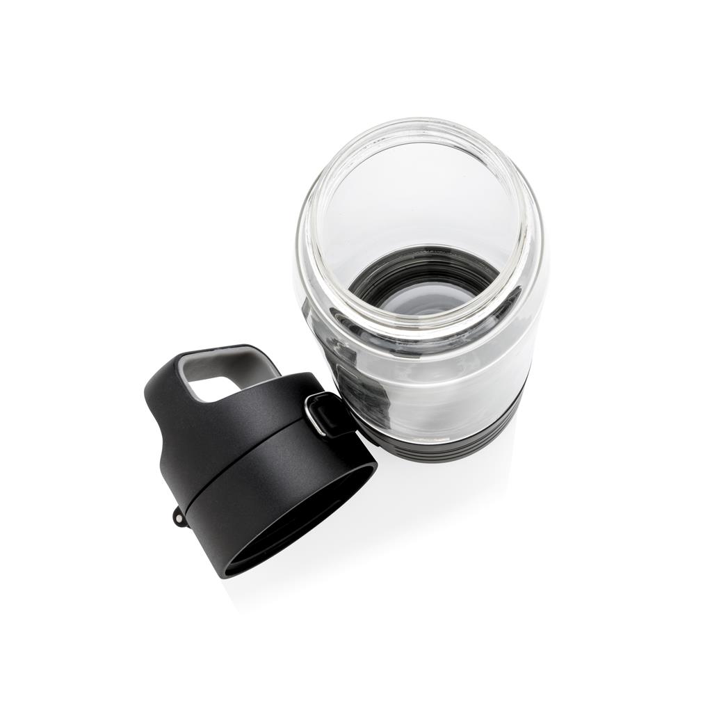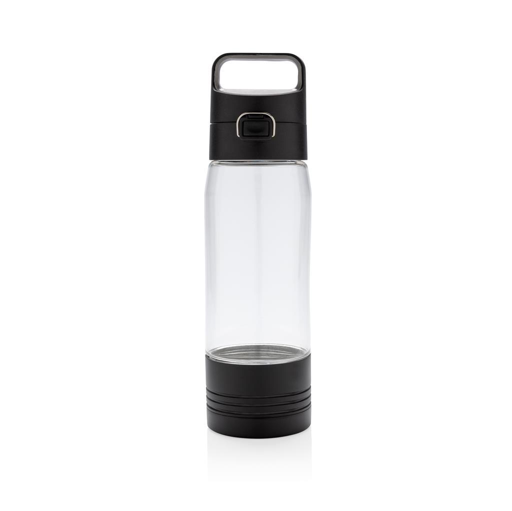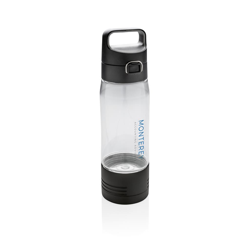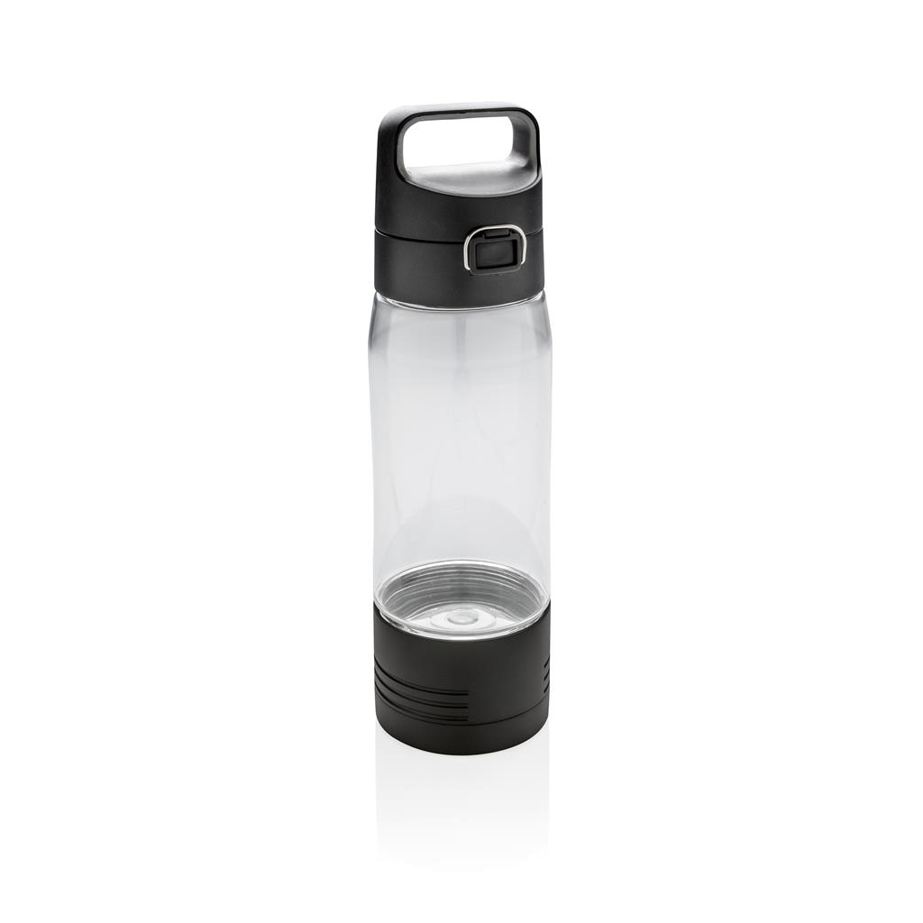 Nepropustná tritanová láhev s uzamykatelným uzávěrem a madlem. V podstavci se nachází 5 000 mAh bezdrátově nabíjející powerbanka. Kompatibilní se všemi zařízeními podporující QI, jako jsou nejnovější generace Android, iPhone 8 a výše. Vstup 5.0V/1.0A. Výstup 5.0V/2.1A. Bezdrátový výstup: 5W. Objem 600 ml. Ochranný vzor® 2 baterií typu Li-poly súčasťou balenia. PMS color 1: Transparent