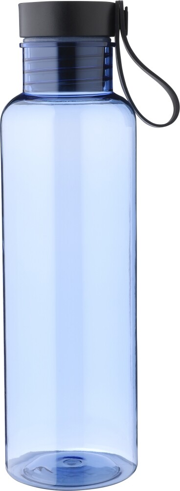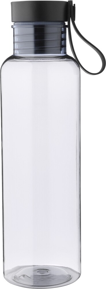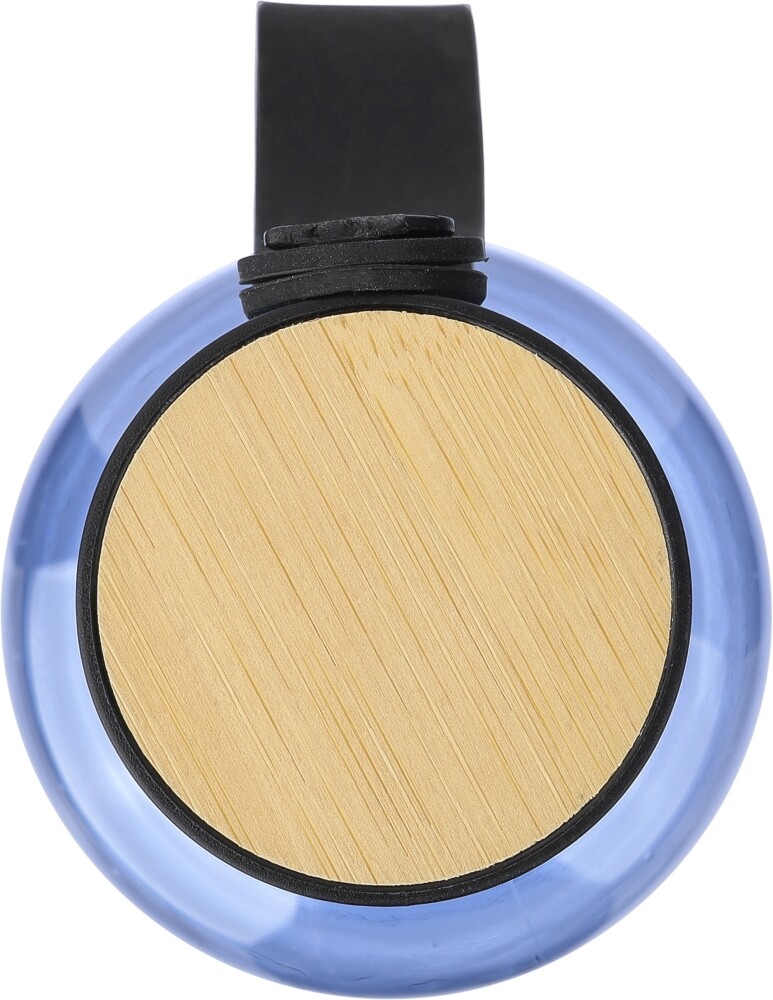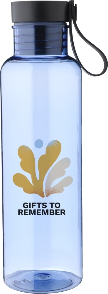 Láhev na pití z rPET (750 ml) s PP víčkem s bambusovým detailem nahoře a silikonovým popruhem na nošení. Jednotlivě baleno v recyklovaném polyetylenovém sáčku, s přepravním obalem v krabičce na vejce. Rozměry: 7,2 x 7,2 x 25 cm